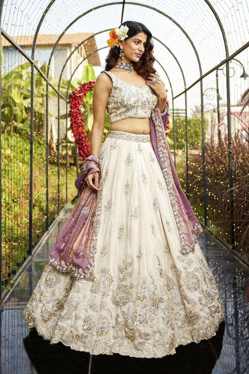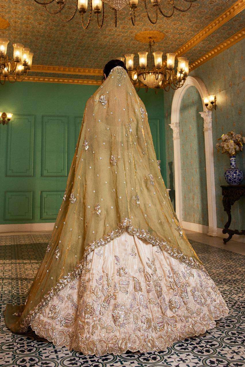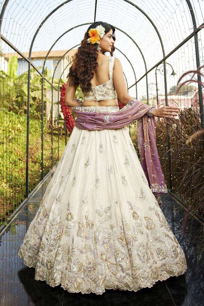 - *Lehenga:* Cream-colored tissue semi-stitched lehenga with sequins and coding work - *Dupatta:* Green gold-colored viscose dupatta with sequins cutwork, ethnic motif, and heavy embroidery work border - *Blouse:* Cream-colored viscose blouse with heavy sequins and thread embroidery work