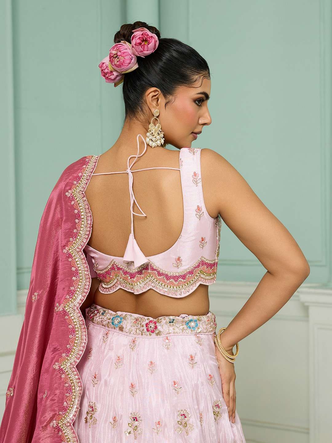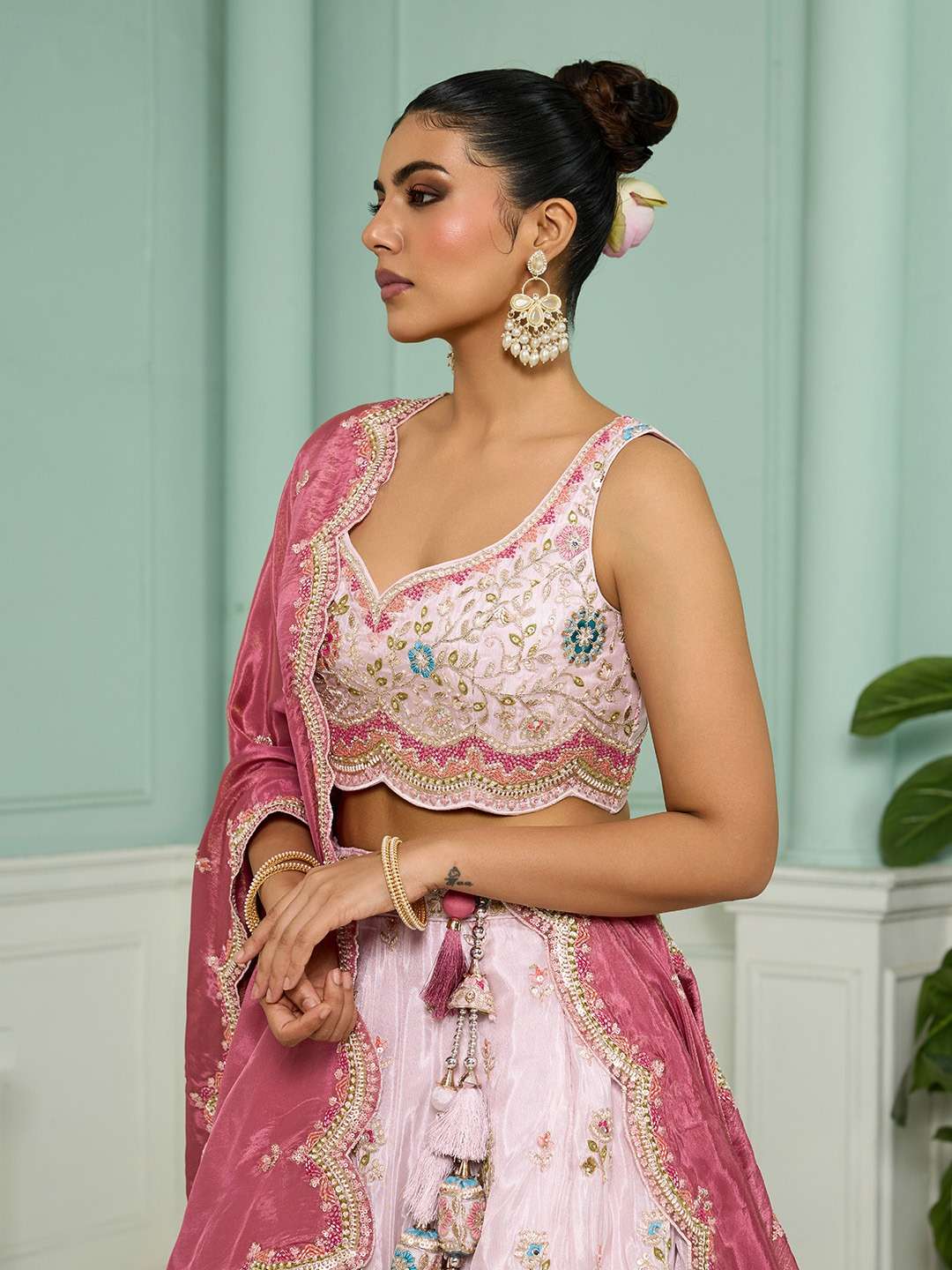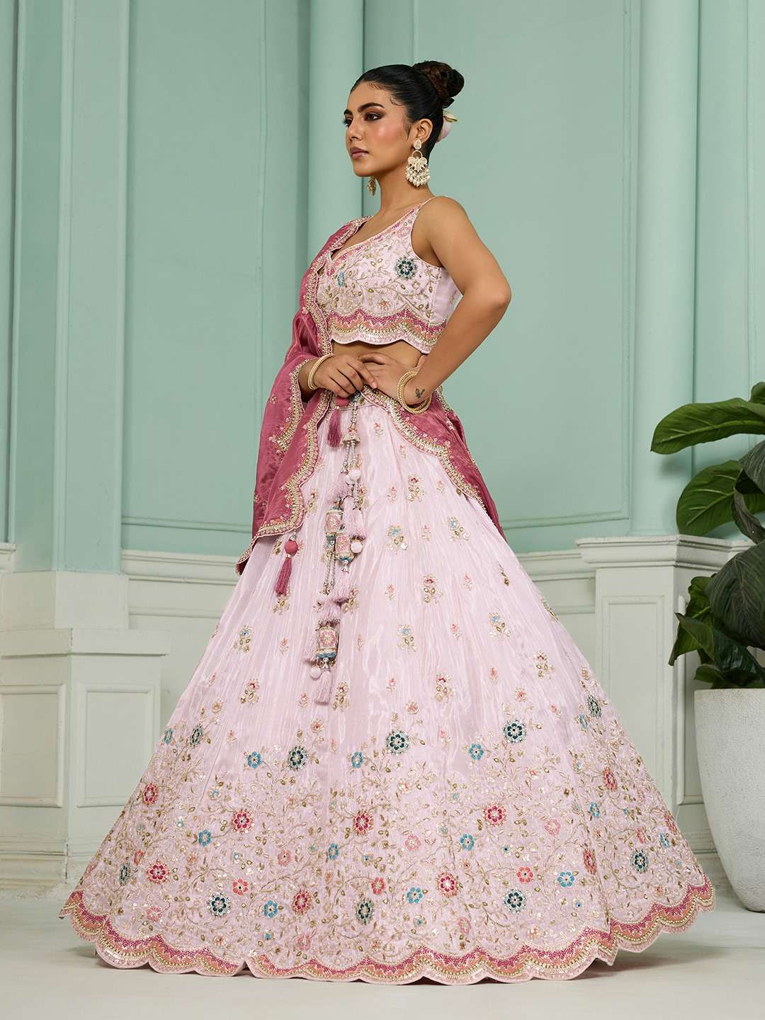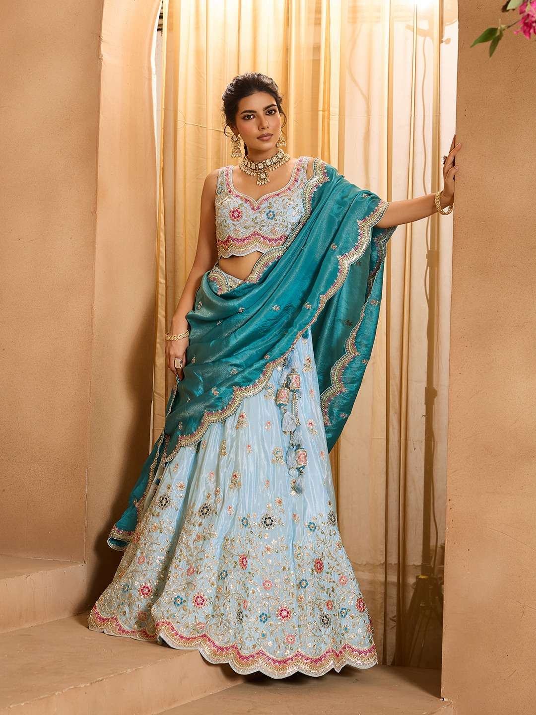 Fabric & Work: Premium Tissue Fabric with Sequins, Beads, Stones, Coding, and Thread Embroidery work. Comes as a Semi-Stitched Lehenga, Unstitched Blouse, and Dupatta.