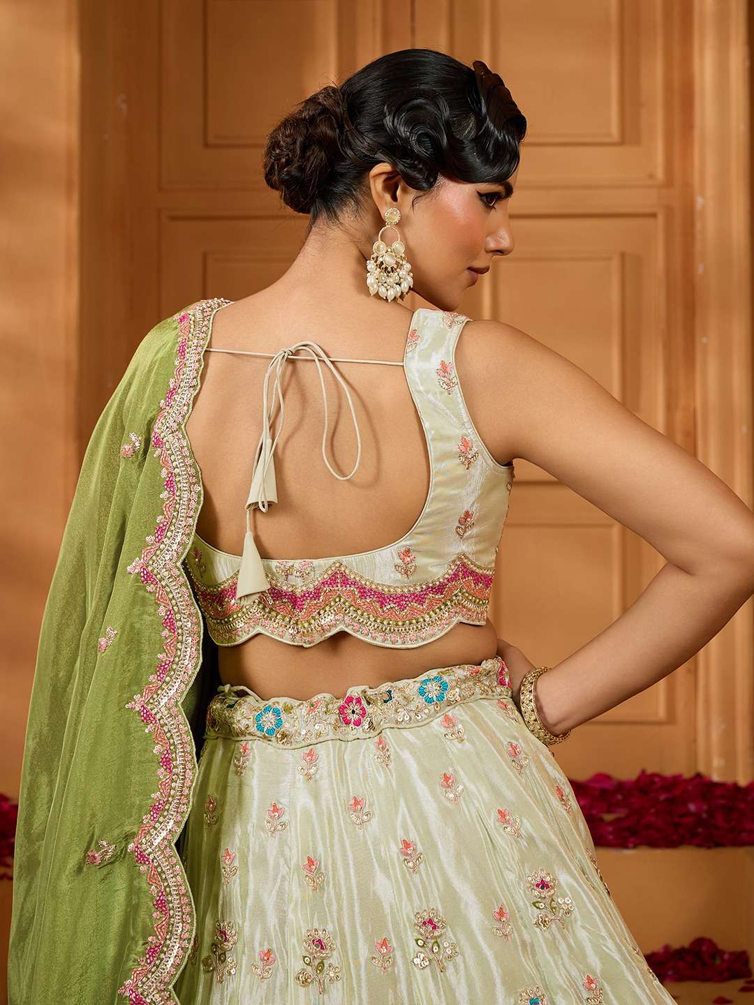 Lehenga: • Color: Lime Green • Fabric: Tissue with full flair • Embellishments: Beads, Stones, Sequins, Coding, and Thread Embroidery • Border: Thread Cutwork Border • Inner: Double Shantoon with Can-Can (12 & 18 inches) + 2 layers of Buckram (4 & 12 inches) • Flair: 4.2 Meters (with inner attached) • Length: 42 Inches • Waist: Customizable up to 40 Inches • Latkan: Unique handmade tassel with ethnic bead work
