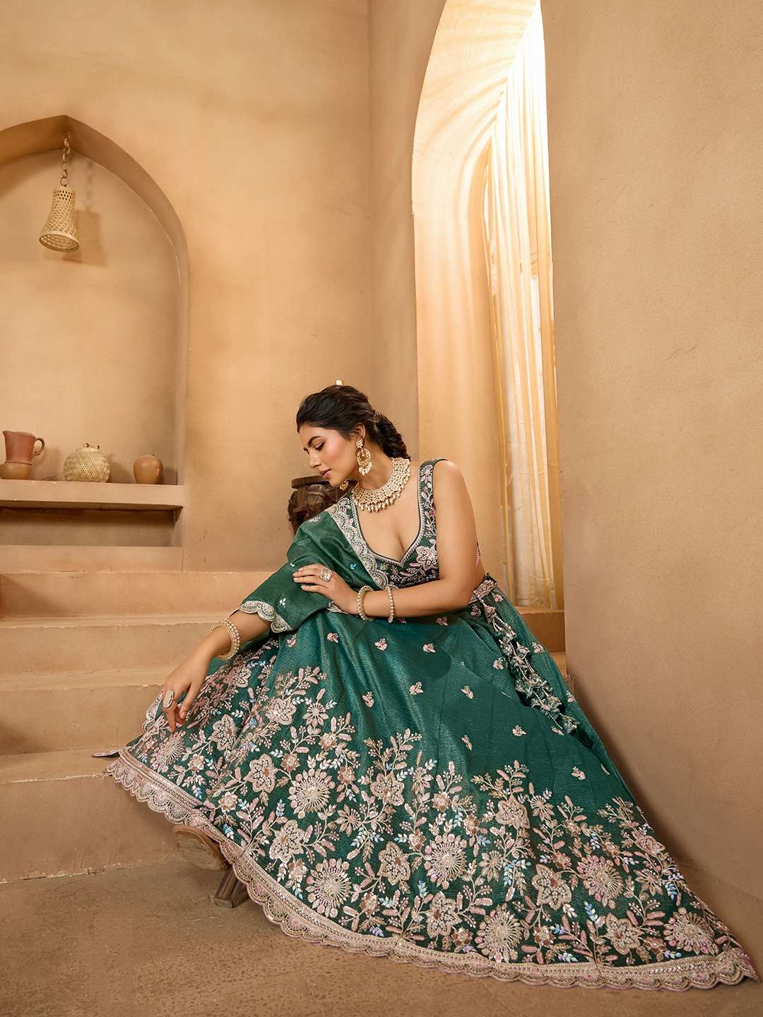 Fabric & Work: Premium Tissue Fabric with Sequins, Stones, Coding & Thread Embroidery. Semi-Stitched Lehenga, Unstitched Blouse & Dupatta included.