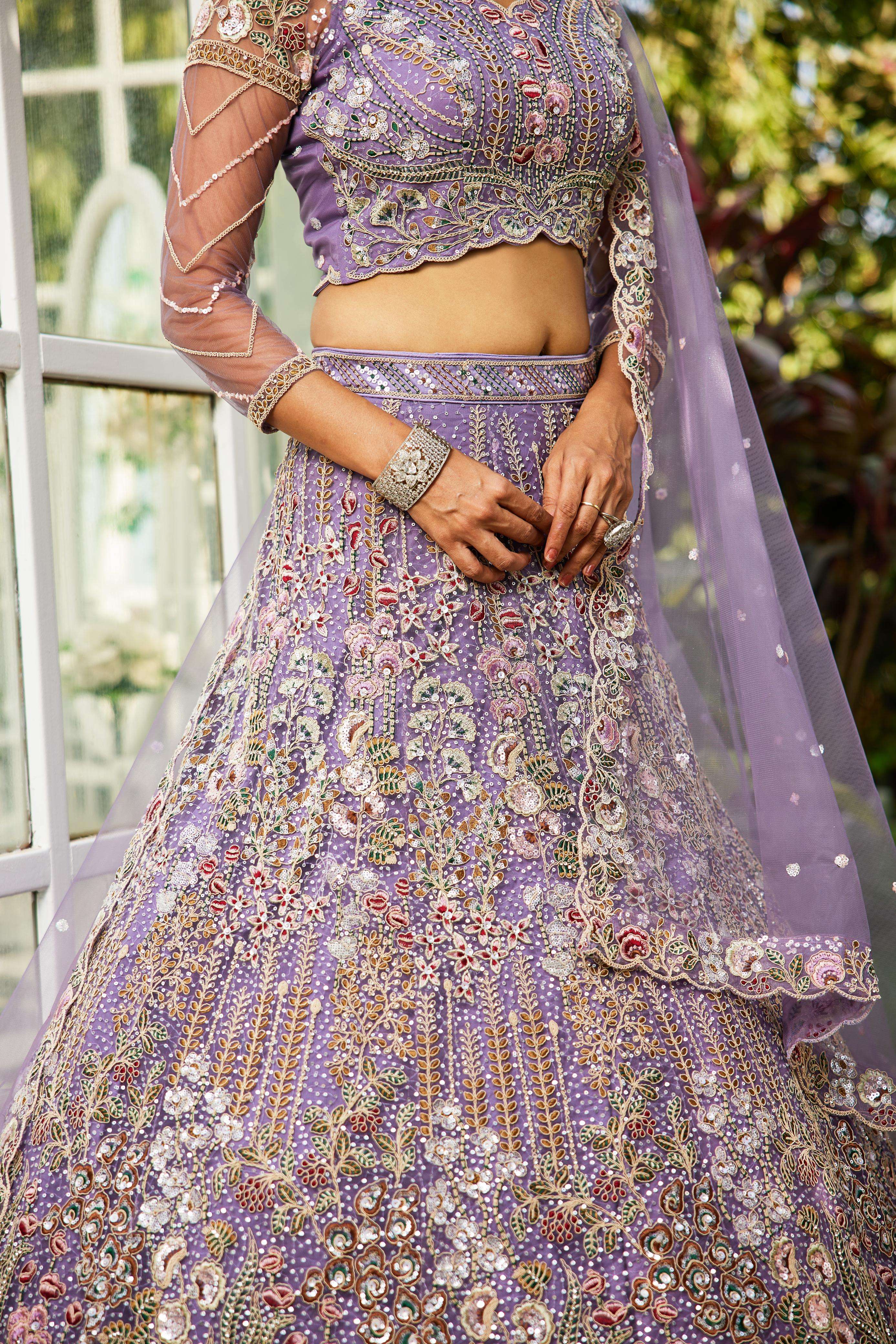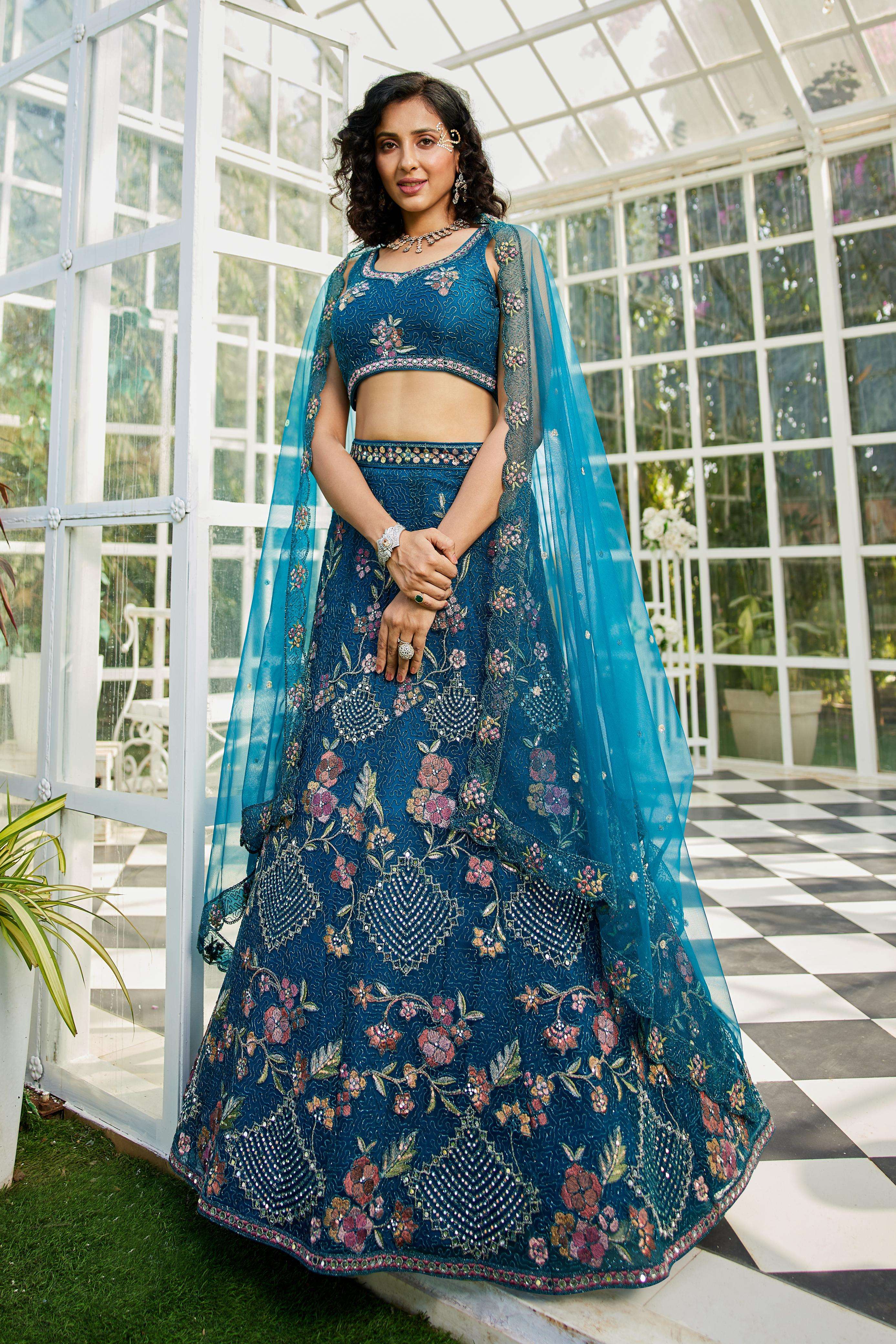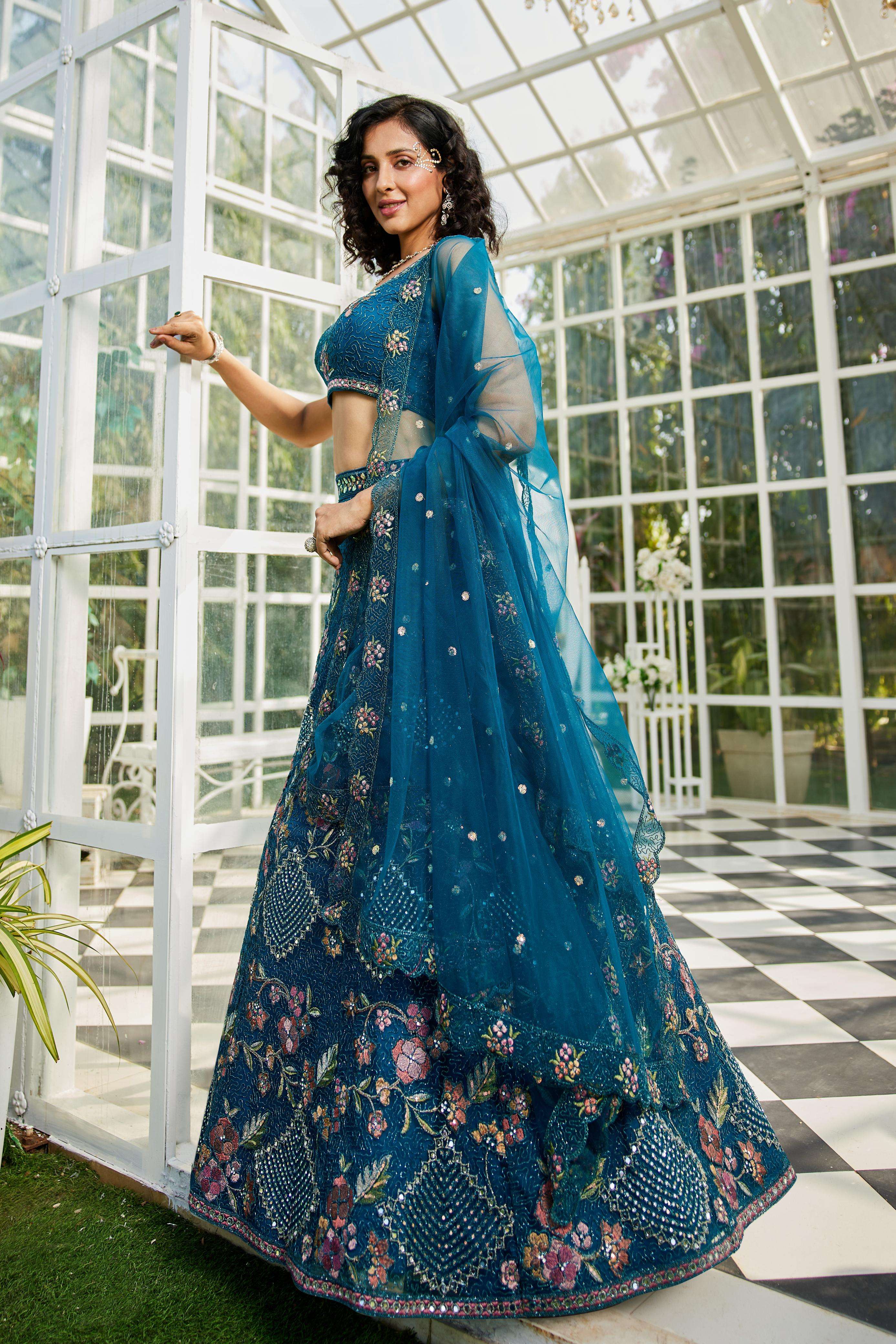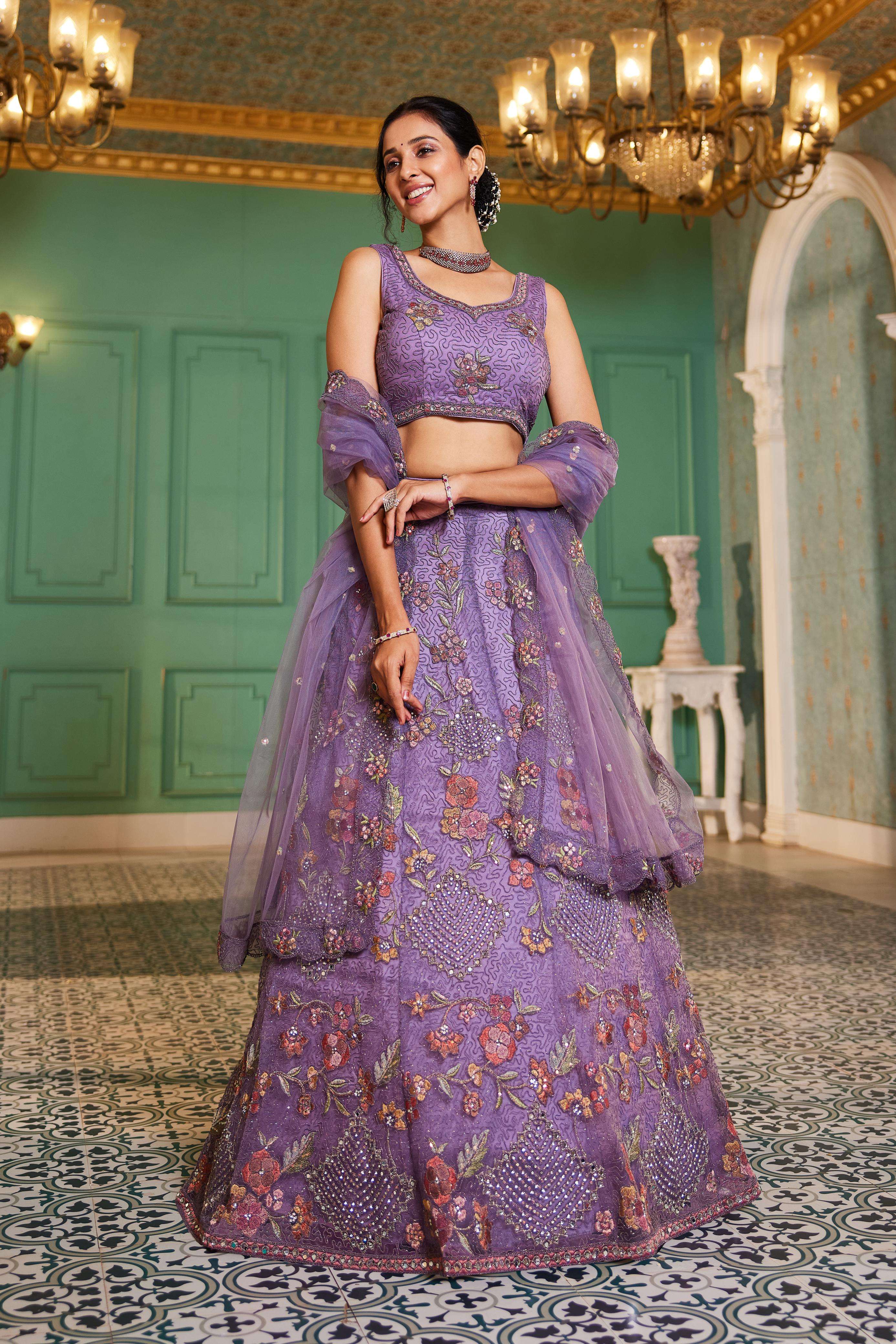 "• Lehenga:- Made of premium quality NEW Colour Net fabric Full Flaire Semi-Stitched Lehenga With Sequins, Zarkan with Coding thread Embroidery work. Has a Coding cutwork border on the hemline. • Lehenga Stitching Note:- Double Shantoon inner with Can Can 18 inch with Buckram 9 inch is given together in lehenga. • Dupatta:- Net Dupatta has a sequinse Ethnic motif with Embroidery work Border. • Blouse:- Net fabric Sweetheart Neck material With Heavy sequinse and thread Embroidery work. Has a shantoon inner attached. • Lehenga Flair : 3 meter with Inner attached."