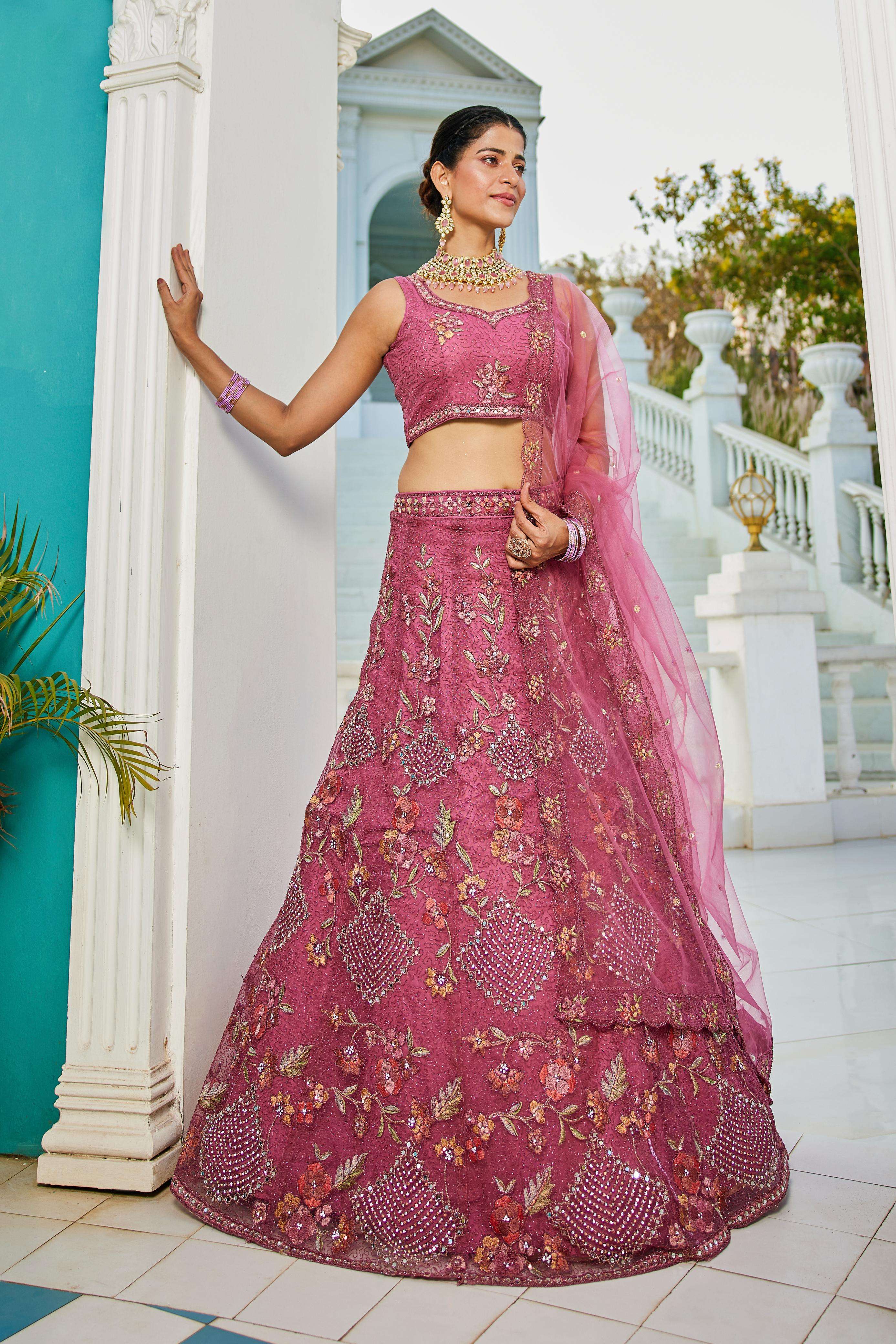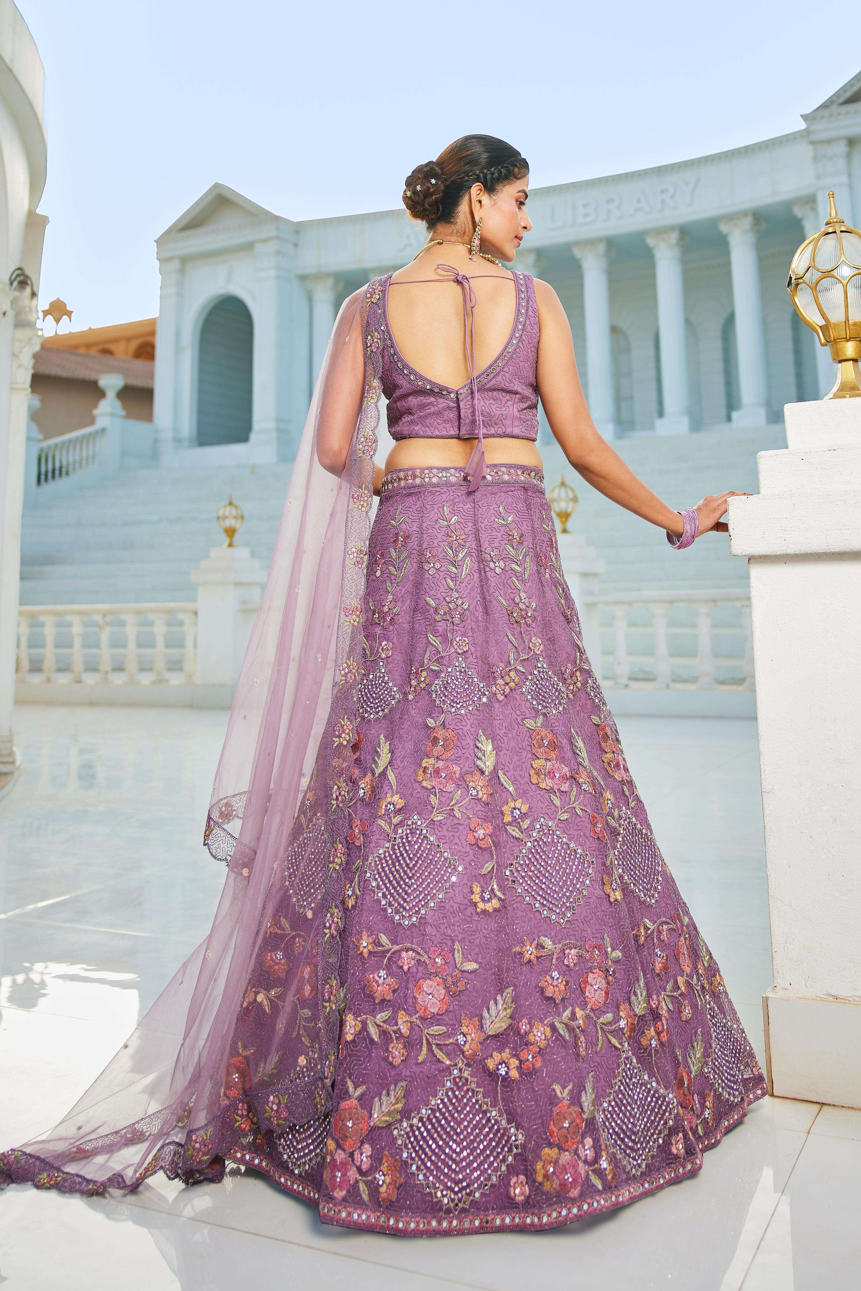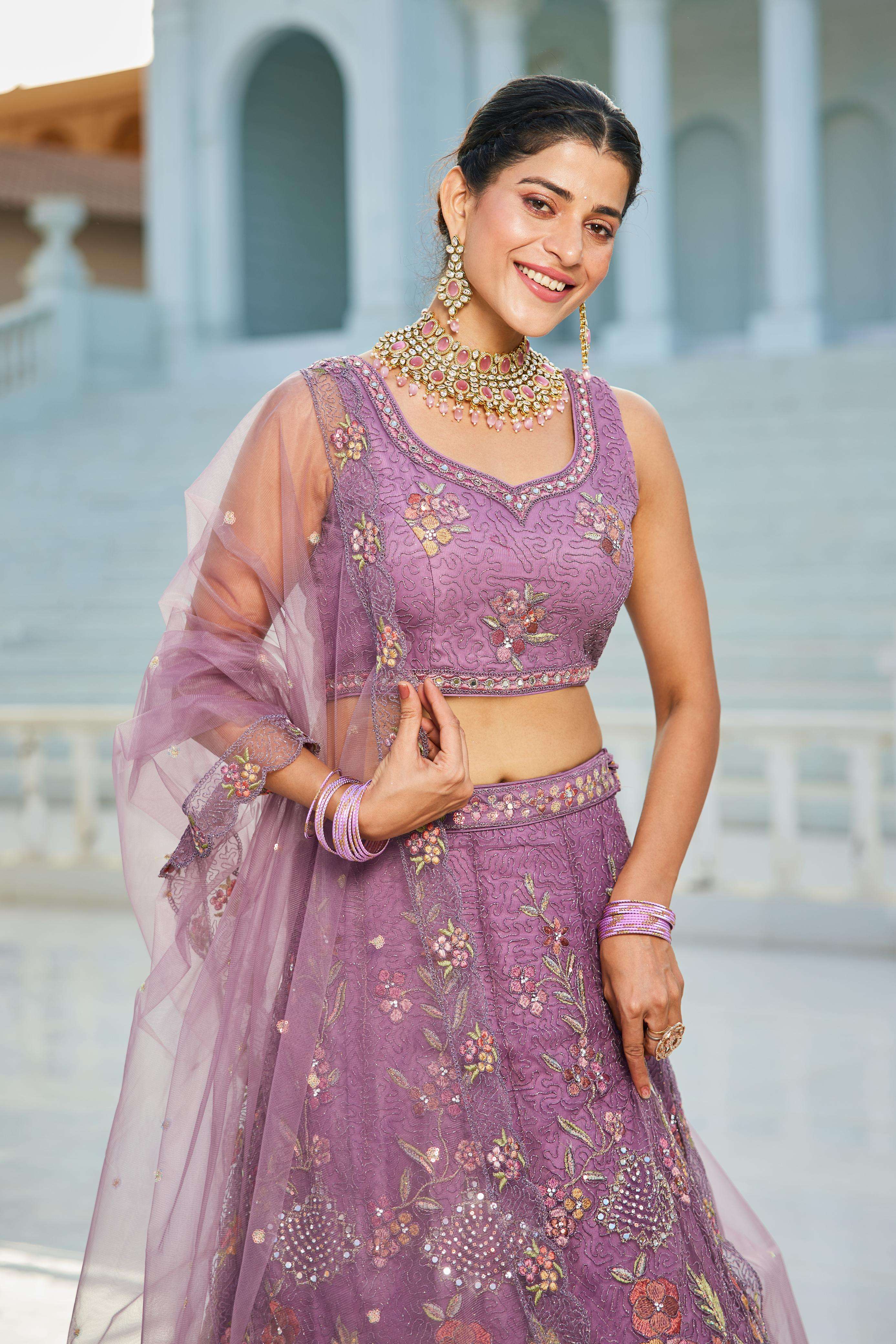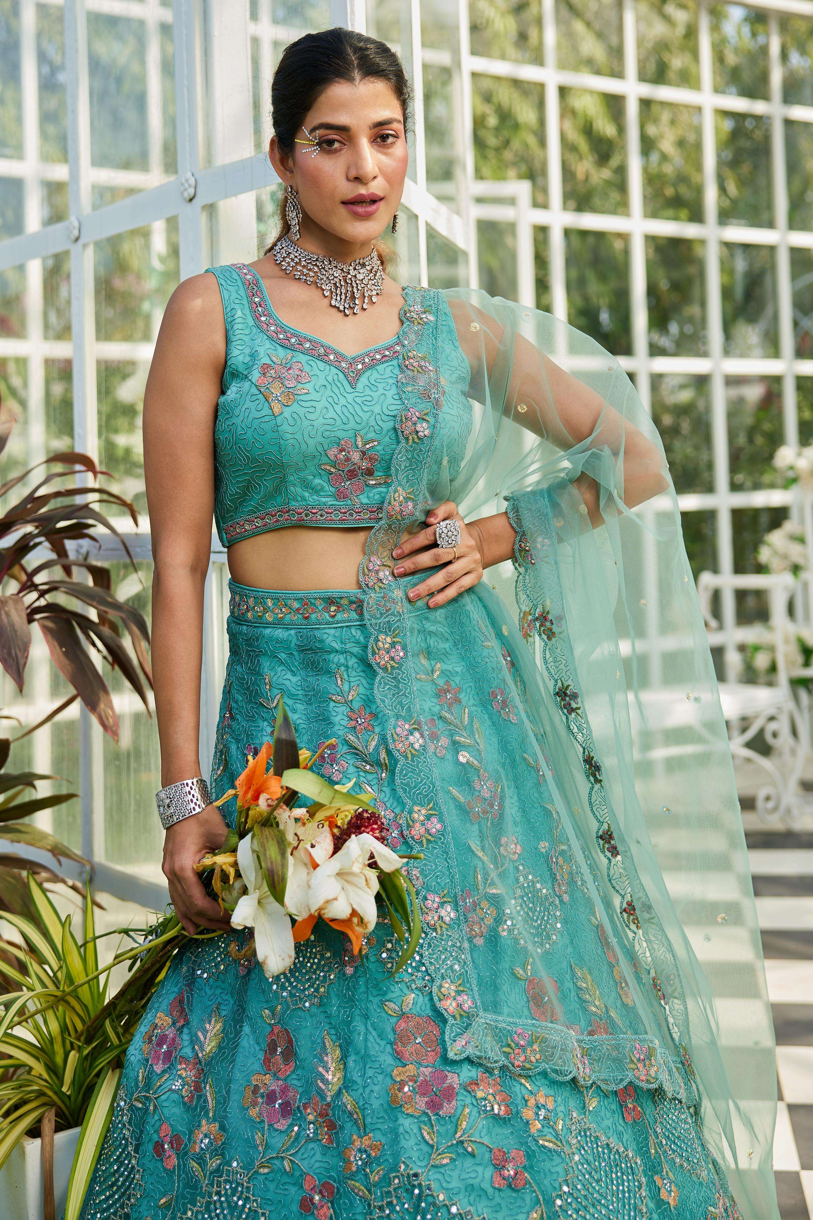 "• Lehenga:- Made of premium quality NEW Colour Net fabric Full Flaire Semi-Stitched Lehenga With Sequins, Zarkan with Coding thread Embroidery work. Has a Coding cutwork border on the hemline. • Lehenga Stitching Note:- Double Shantoon inner with Can Can 18 inch with Buckram 9 inch is given together in lehenga. • Dupatta:- Net Dupatta has a sequinse Ethnic motif with Embroidery work Border. • Blouse:- Net fabric Sweetheart Neck material With Heavy sequinse and thread Embroidery work. Has a shantoon inner attached. • Lehenga Flair : 3 meter with Inner attached."