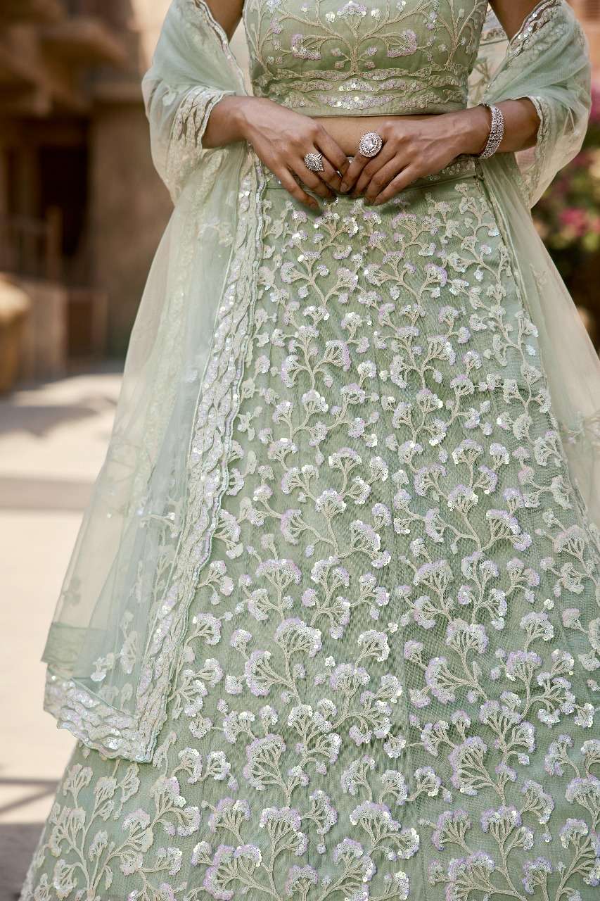 *Product Description* - *Lehenga:* Lime green net semi-stitched lehenga with sequins and coding work - *Dupatta:* Lime green net dupatta with heavy coding, zarkans embroidery, and cutwork border - *Blouse:* Lime green net blouse with sweetheart pattern, heavy sequins, coding, and thread embroidery work