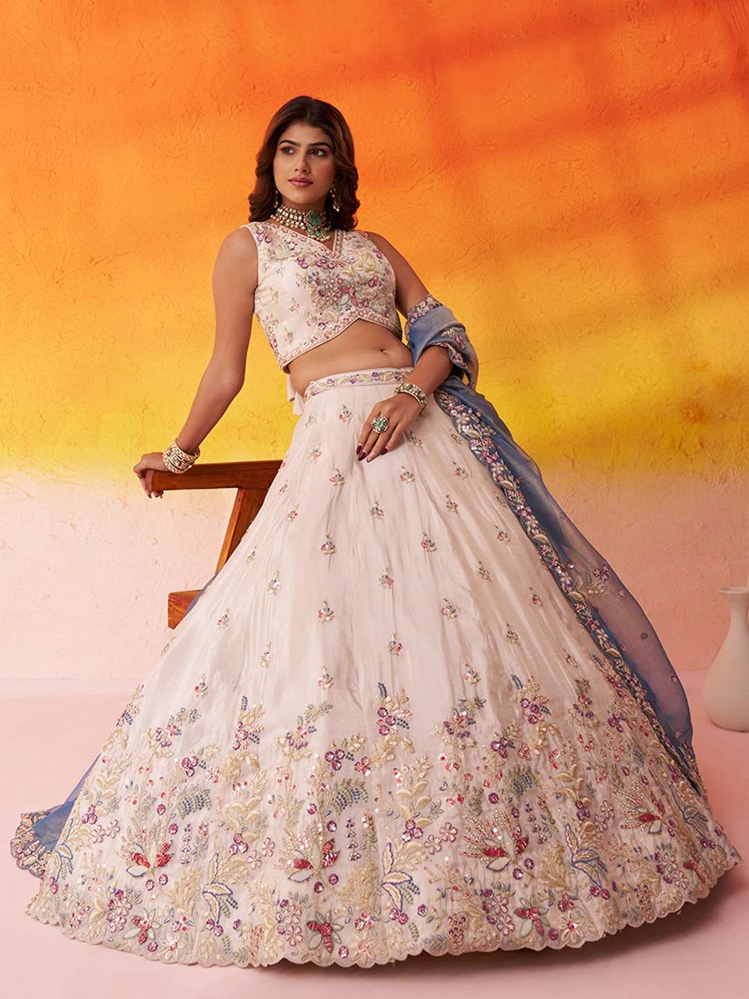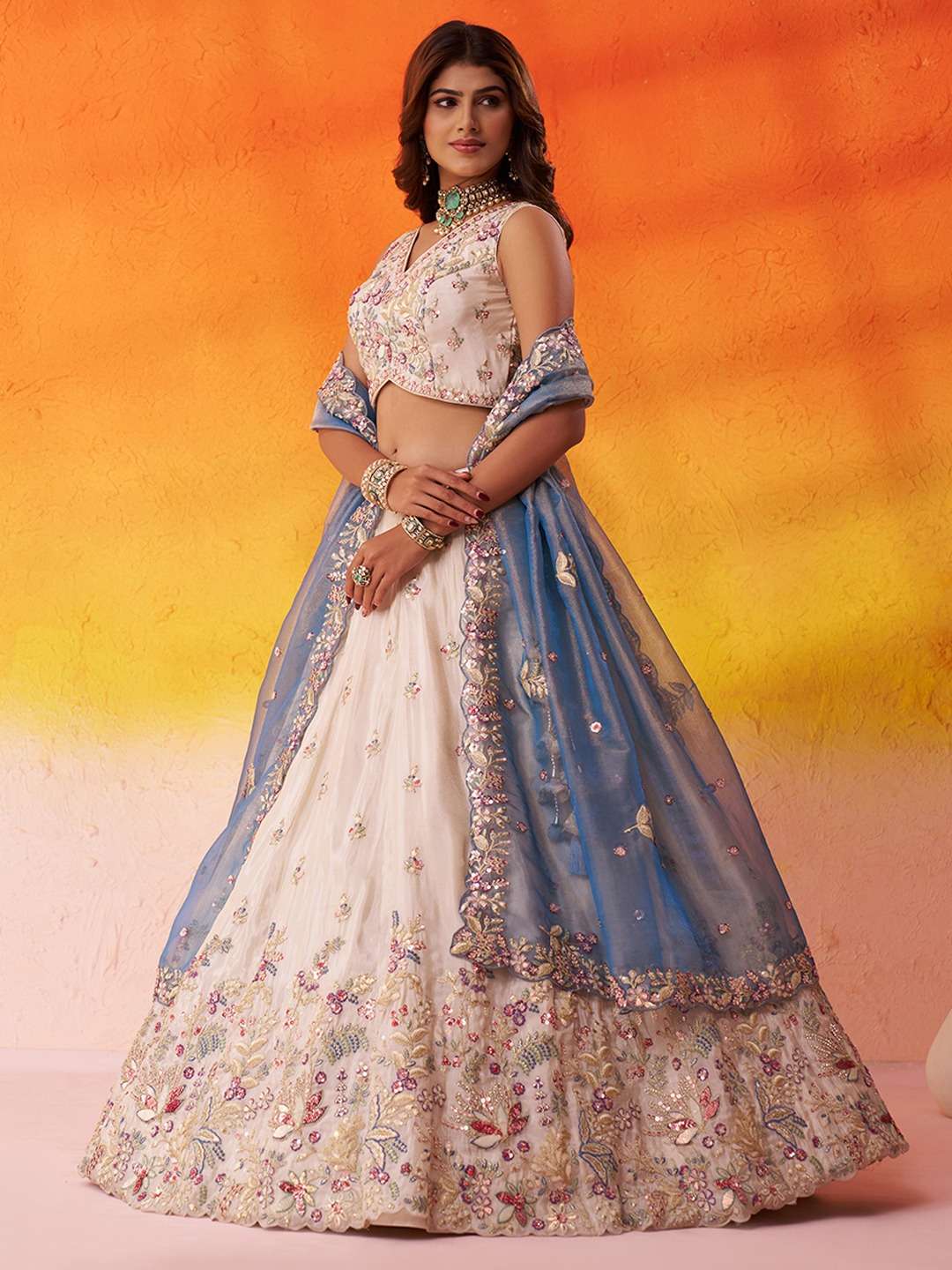 • Lehenga Fabric: Premium Beige Tissue • Heavy Moti, Sequins, Coding & Thread Embroidery • Elegant Thread Work Border on Hemline • Full Flair Semi-Stitched Lehenga