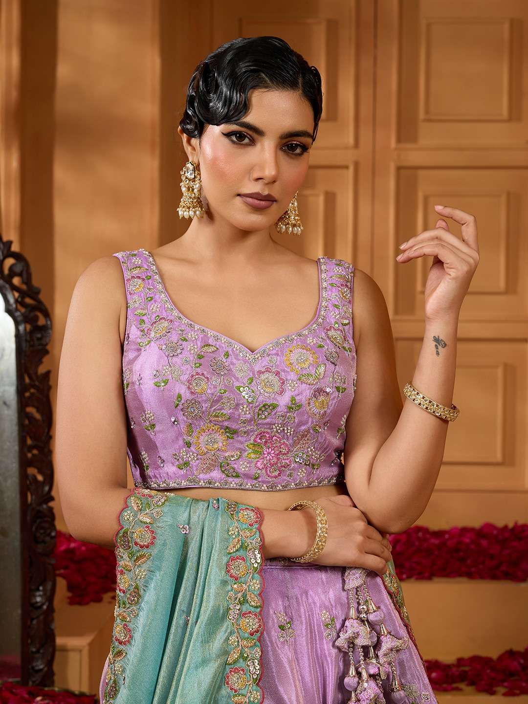 Blouse (Choli): • Fabric: Lavender Tissue with Shantoon Inner • Unstitched (Customizable up to 42” Bust) • Designed with a Sweetheart Neckline • Heavy Sequins, Thread Embroidery, and Coding Work