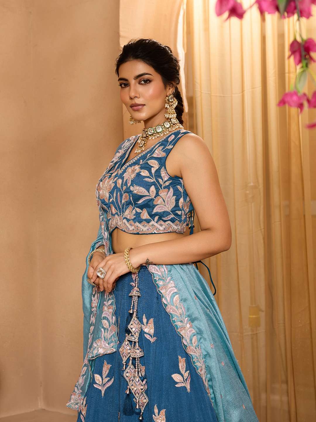 Lehenga: • Fabric: Premium Silk in Elegant Green (also available in Teal) • Semi-Stitched with Full Flair (3.5 meters) • Beautifully embellished with Beads, Stones, Sequins, Coding & Thread Embroidery Work • Hemline finished with Intricate Cutwork Border • Inner: Double Shantoon with Can-Can (13” & 20”) and 2 Layers of Buckram (4” & 12”) for Added Volume • Length: 42 inches (Customizable Waist up to 40”) • Features Unique Handmade Tassel Latkan with Beads & Ethnic Detailing