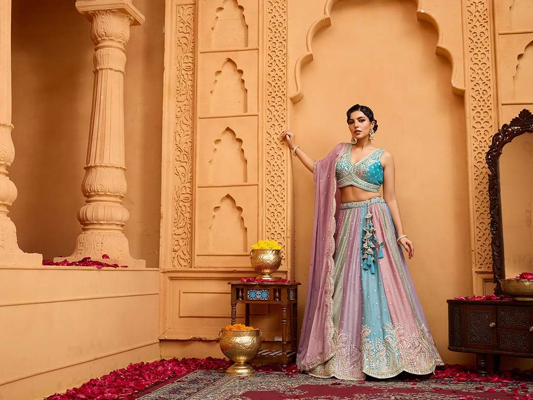 A masterpiece crafted from premium Georgette fabric, this semi-stitched lehenga set features intricate sequins, stone, and thread embroidery with elegant coding work and a detailed cutwork border on the hemline — perfect for festive and wedding occasions.