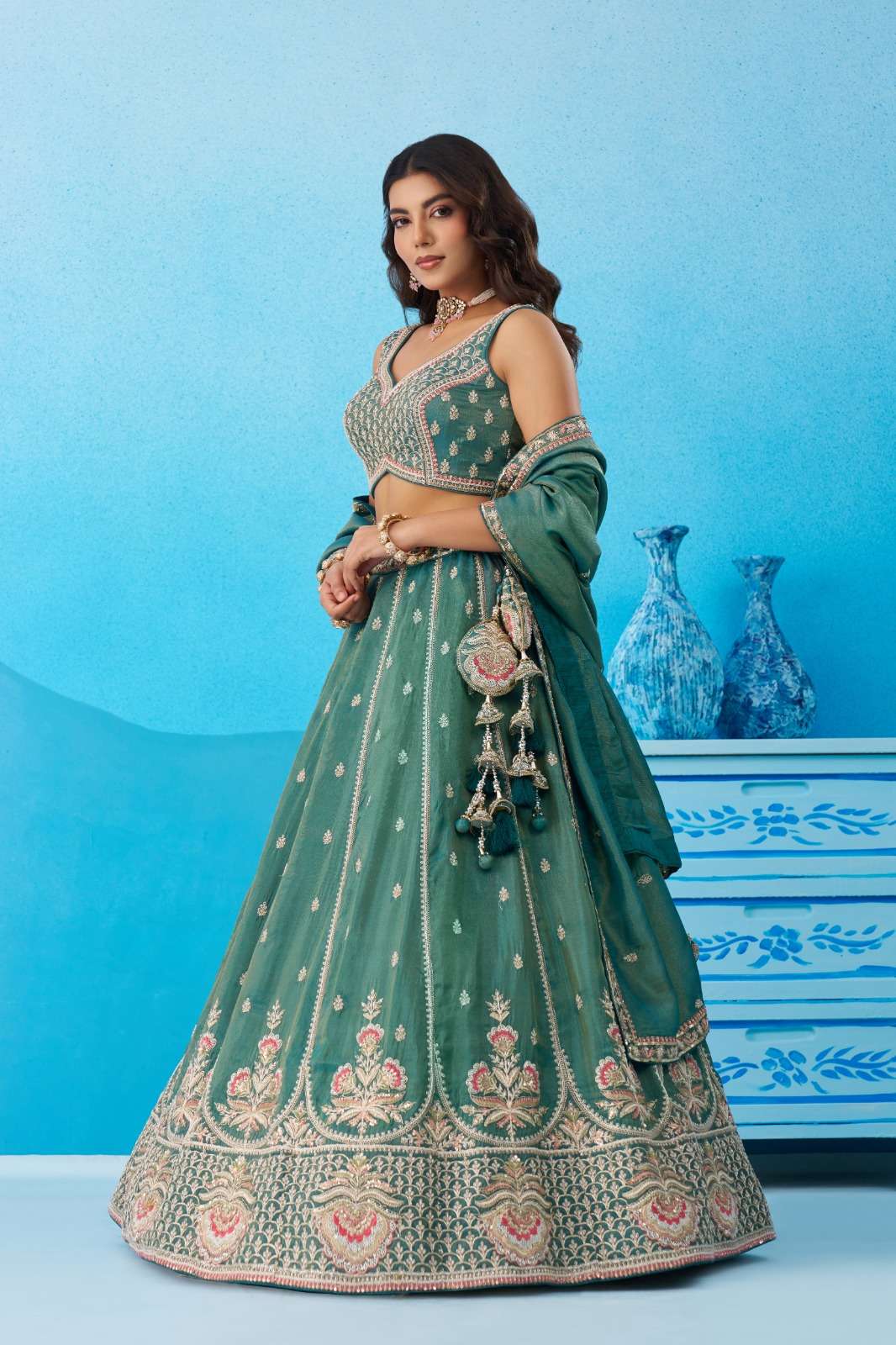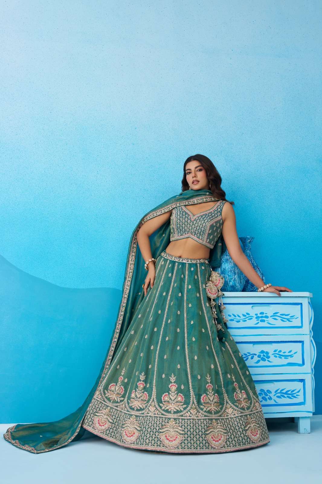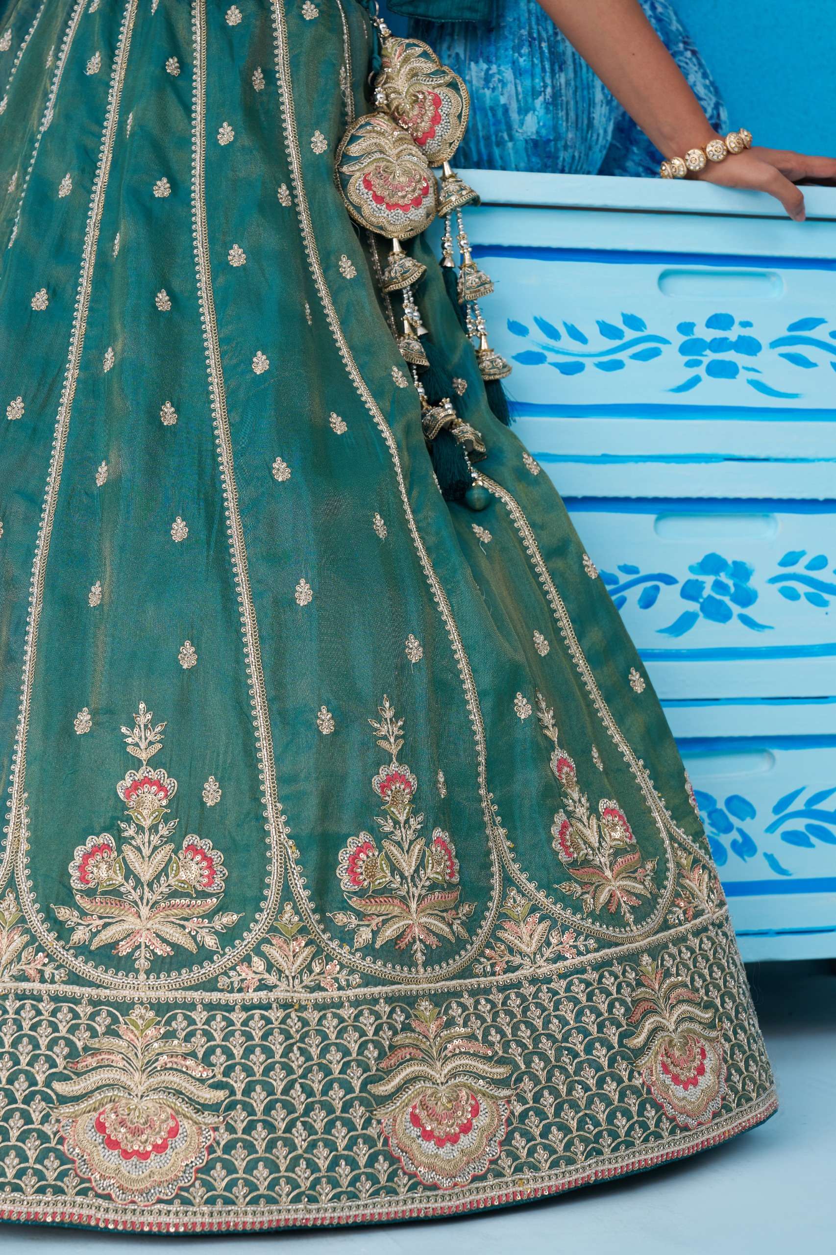 ✨ Lehenga : Elegant semi-stitched lehenga crafted in premium Teal Tissue fabric with heavy beads & sequins floral embroidery work. Lehenga comes with 3.5 meter flair and beautiful colourful taping heavy border on the hemline. Supported with double shantoon inner, 12 & 18 inch can-can and 4 & 12 inch buckram for perfect volume and shape. Lehenga is also decorated with heavy latkan tassels for a rich finishing touch.