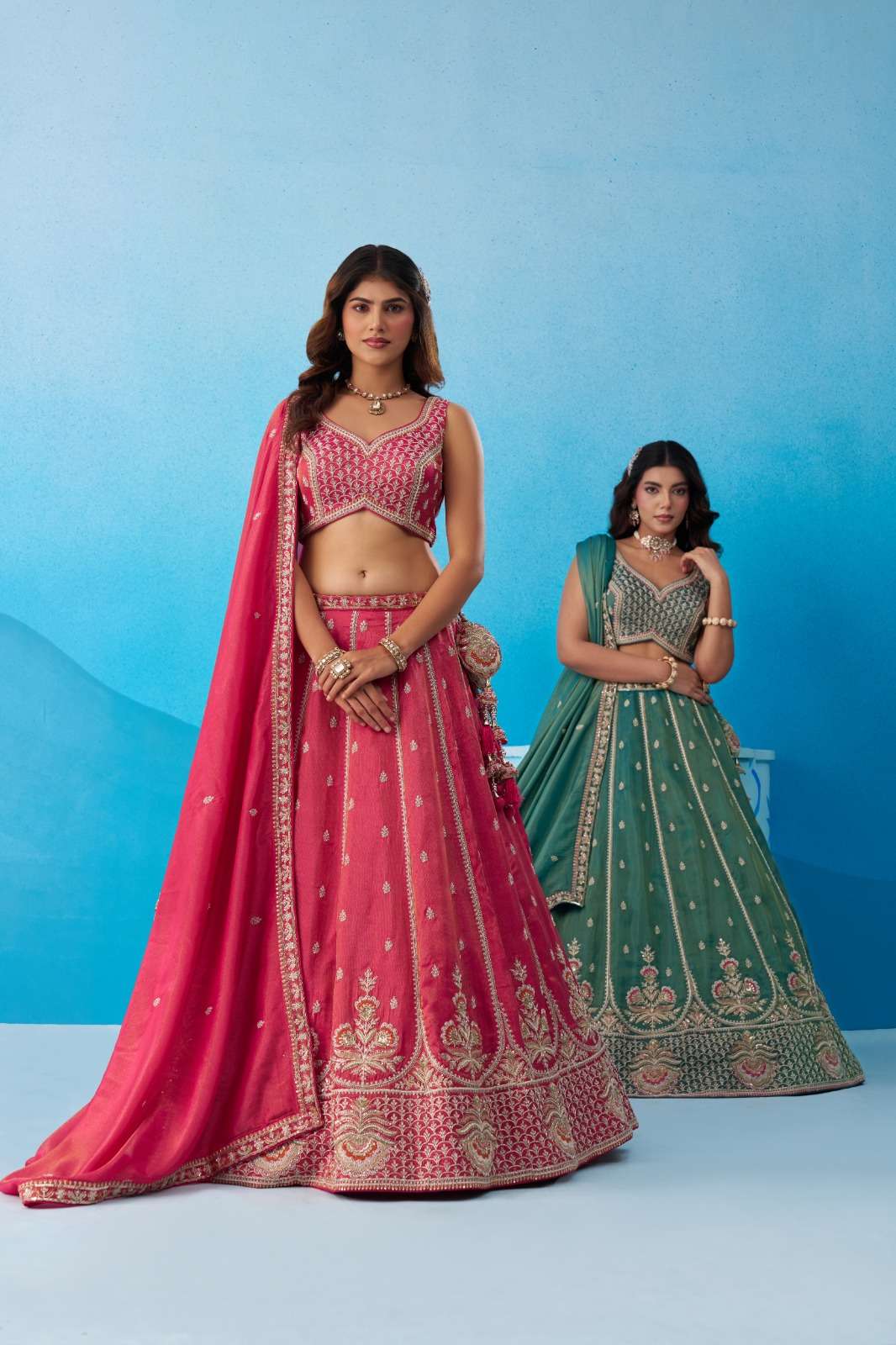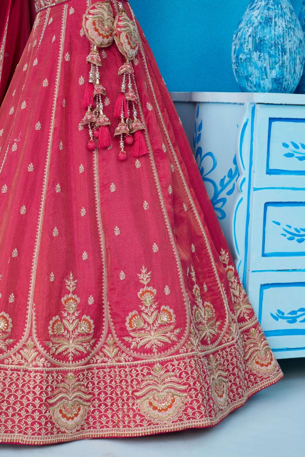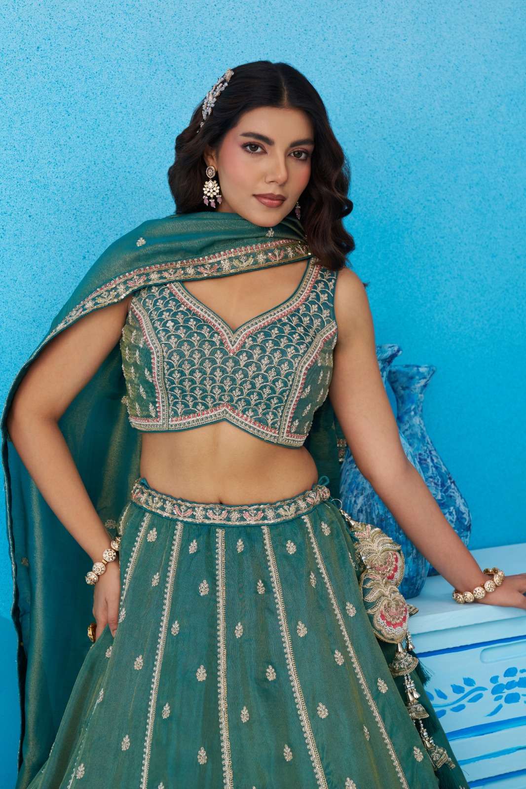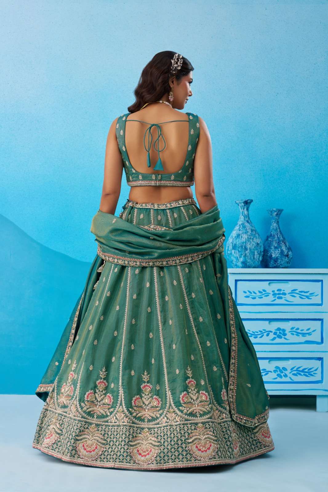 ✨ Lehenga : Elegant semi-stitched lehenga crafted in premium Teal Tissue fabric with heavy beads & sequins floral embroidery work. Lehenga comes with 3.5 meter flair and beautiful colourful taping heavy border on the hemline. Supported with double shantoon inner, 12 & 18 inch can-can and 4 & 12 inch buckram for perfect volume and shape. Lehenga is also decorated with heavy latkan tassels for a rich finishing touch.