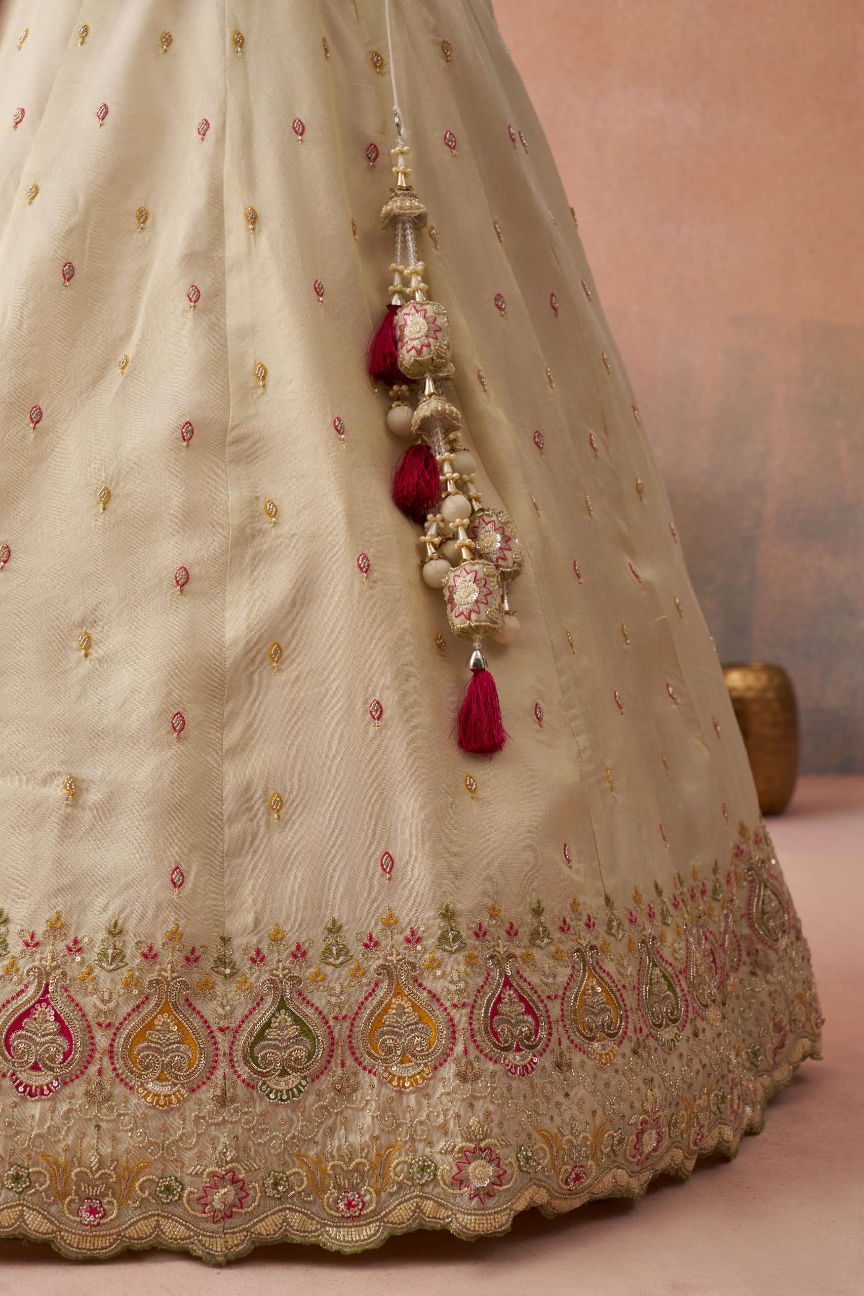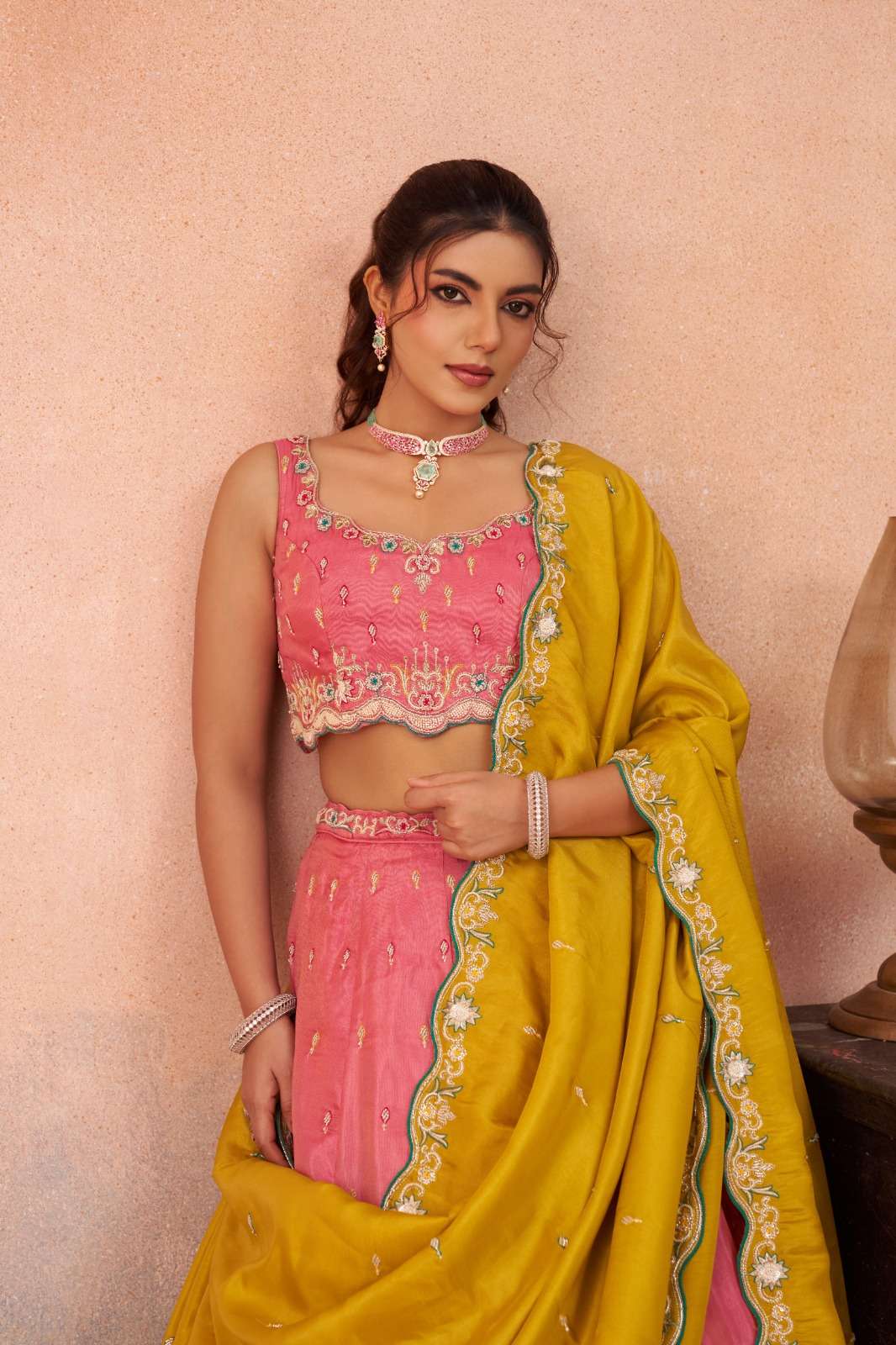 Dupatta: Beautiful Pink Cosmos Silk dupatta with green thread embroidery & cutwork border • Length: 2.5 Meter • Width: 1 Meter