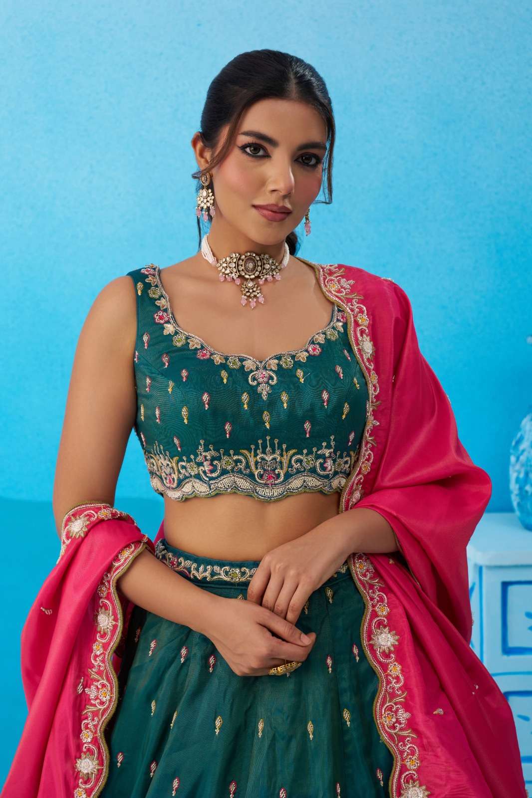 Blouse: Matching Teal Cosmos Silk blouse with heavy embroidery. • Sweetheart neckline • Attached shantoon lining • Bust: Up to 42 Inches (Semi-stitched) • 12 inch embroidered sleeves