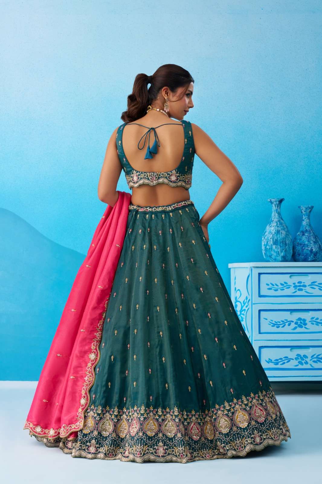 Lehenga: Elegant semi-stitched lehenga crafted in Teal Cosmos Silk with heavy sequins, beads, coding & thread embroidery work. • Flair: 4.2 Meter • Length: 42 Inches • Waist: Up to 40 Inches • Cutwork embroidered border on hemline • Double shantoon inner • 12 & 18 inch can-can + buckram for perfect flare