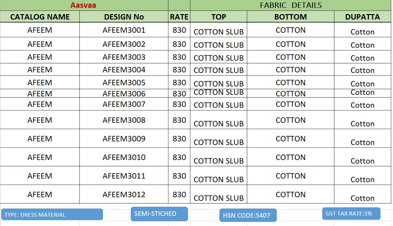 Buy Online Afeem By Nitya Nx Slub Cotton Suits Catalog Wholesale Supplier And Dealer Surat 12 Pcs of Full Catalogue at Wholesale Price. Looking for Afeem By Nitya Nx Slub Cotton Suits Catalog Wholesale Supplier And Dealer Surat Full Catalouge at Best Price? Buy Now Afeem By Nitya Nx Slub Cotton Suits Catalog Wholesale Supplier And Dealer Surat at Wholesale Rate of Rs 9960 with Total 12 Pcs from authroized dealer and supplier of BRAND'S Brand. Cost of Each piece is just only Rs 830 which is very low and affordable price to resale the product in your retail store ,This is Surat based Wholesale Supplier & Dealer of BRAND'S Brand. Click on Brand name to Know more about BRAND'S Brand's products.Call or Whatsapp on 9898838984 for booking or enquiry