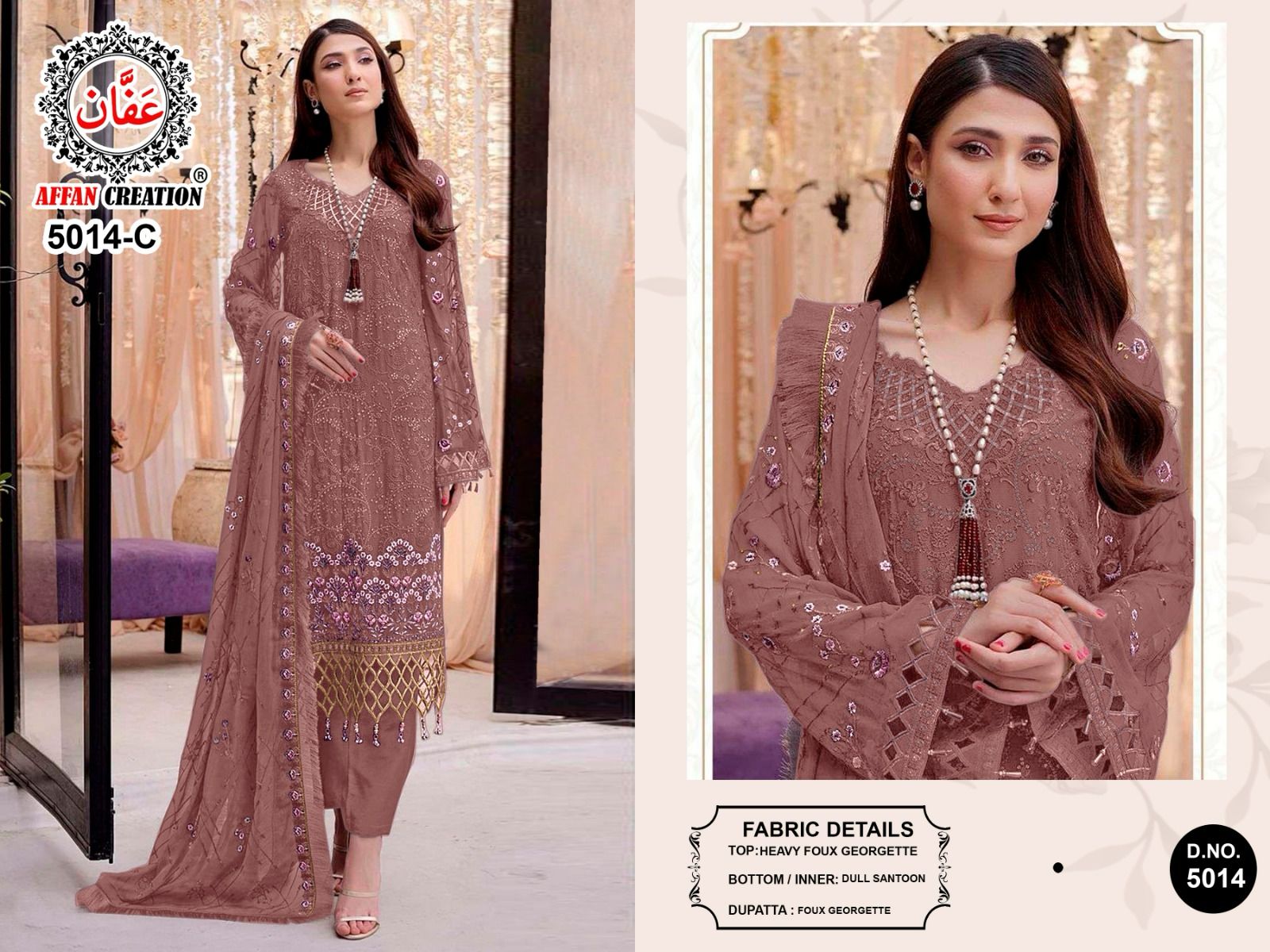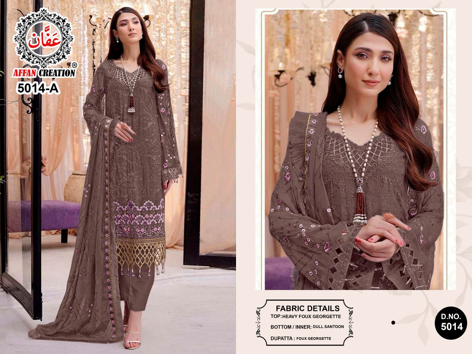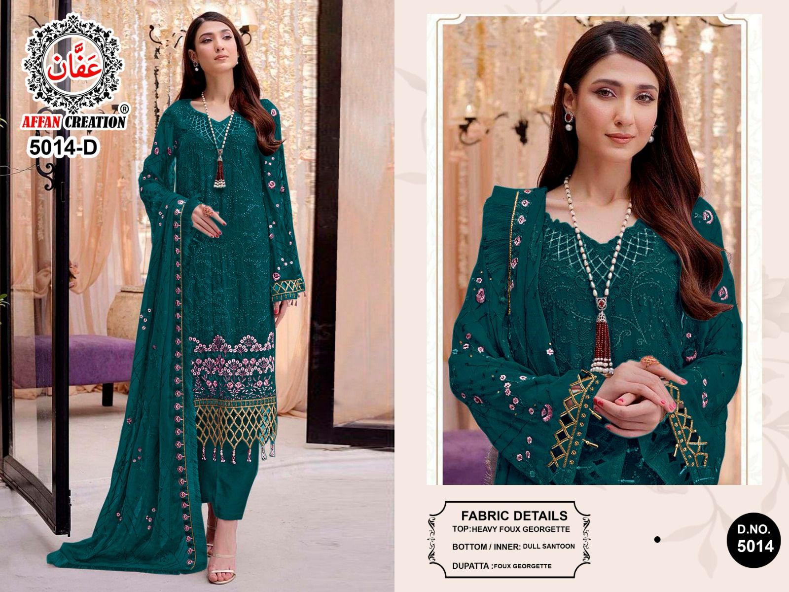 Buy Online Affan Creation D No 5014 Georgette Pakistani Suits 4 Pcs of Full Catalogue at Wholesale Price. Looking for Affan Creation D No 5014 Georgette Pakistani Suits Full Catalouge at Best Price? Buy Now Affan Creation D No 5014 Georgette Pakistani Suits at Wholesale Rate of Rs 5000 with Total 4 Pcs from authroized dealer and supplier of Brand. Cost of Each piece is just only Rs 1250 which is very low and affordable price to resale the product in your retail store ,This is Surat based Wholesale Supplier & Dealer of Brand. Click on Brand name to Know more about Brand's products.Call or Whatsapp on 9898838984 for booking or enquiry