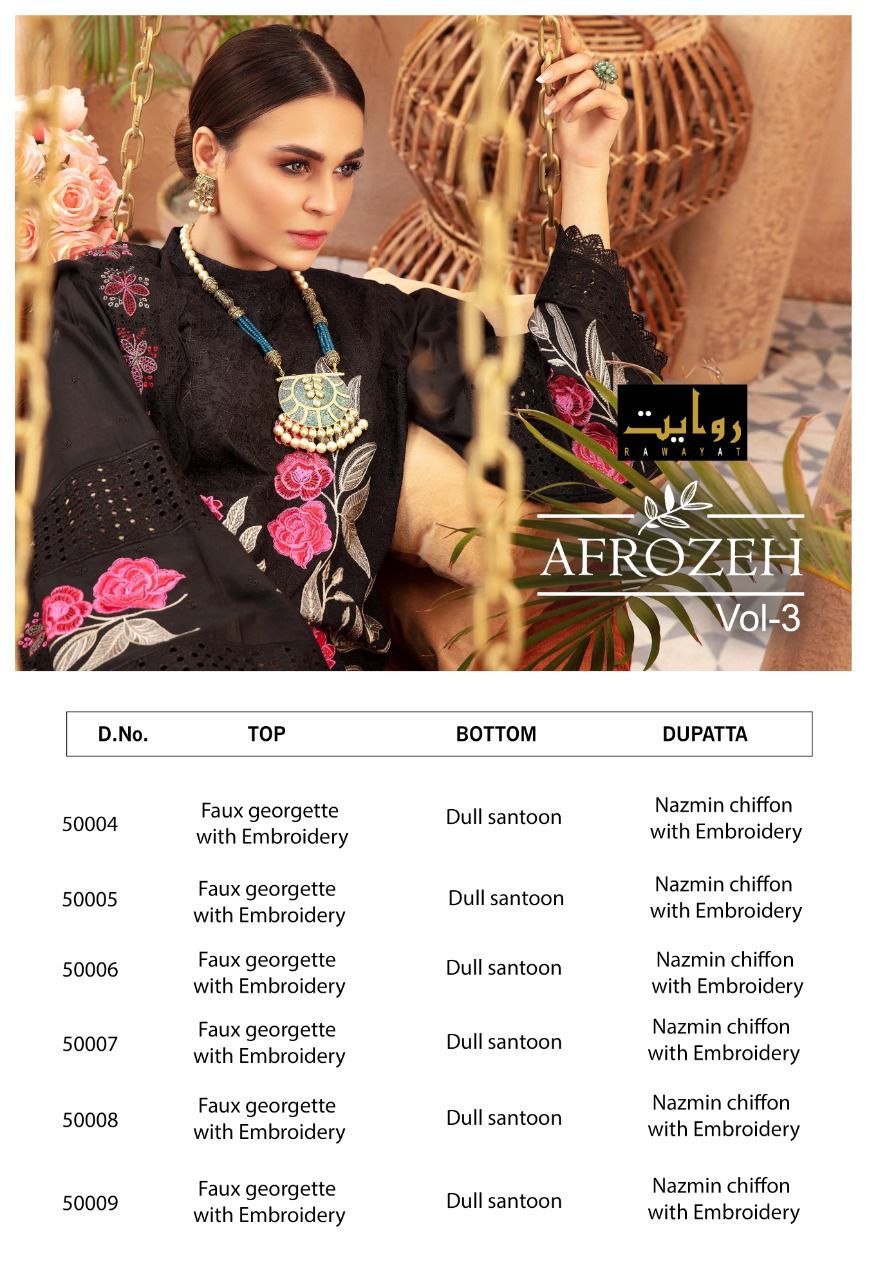 Buy Online Afrozeh Vol 3 By Collection 2021 By Rawayat Manufacturer Traders And Dealer From India 6 Pcs of Full Catalogue at Wholesale Price. Looking for Afrozeh Vol 3 By Collection 2021 By Rawayat Manufacturer Traders And Dealer From India Full Catalouge at Best Price? Buy Now Afrozeh Vol 3 By Collection 2021 By Rawayat Manufacturer Traders And Dealer From India at Wholesale Rate of Rs 7500 with Total 6 Pcs from authroized dealer and supplier of Brand. Cost of Each piece is just only Rs 1250 which is very low and affordable price to resale the product in your retail store ,This is Surat based Wholesale Supplier & Dealer of Brand. Click on Brand name to Know more about Brand's products.Call or Whatsapp on 9898838984 for booking or enquiry