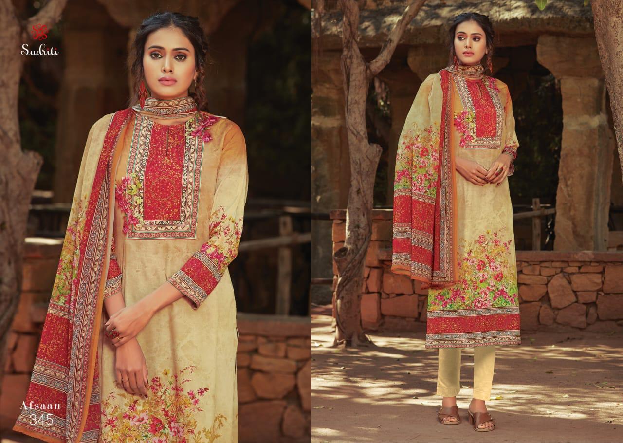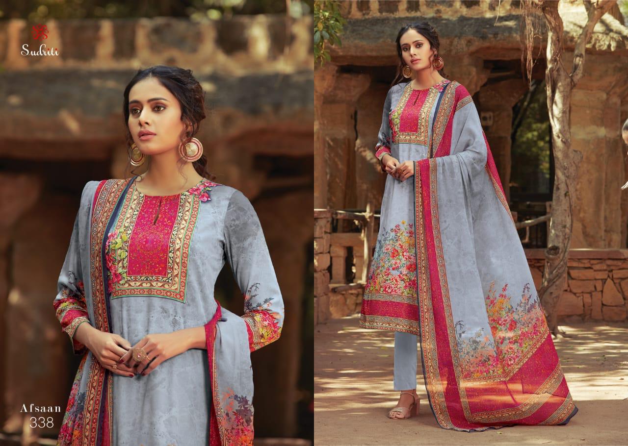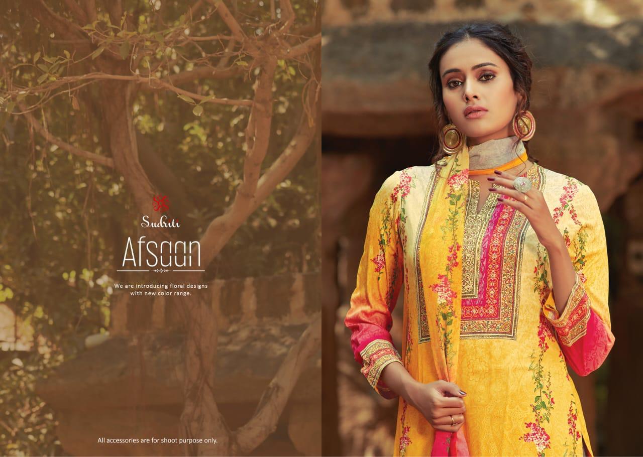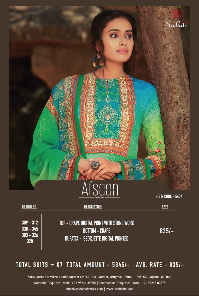 Buy Online Afsaan By Sudriti Crape Digital Suits Wholesaler 7 Pcs of Full Catalogue at Wholesale Price. Looking for Afsaan By Sudriti Crape Digital Suits Wholesaler Full Catalouge at Best Price? Buy Now Afsaan By Sudriti Crape Digital Suits Wholesaler at Wholesale Rate of Rs 5845 with Total 7 Pcs from authroized dealer and supplier of SUDRITI Brand. Cost of Each piece is just only Rs 835 which is very low and affordable price to resale the product in your retail store ,This is Surat based Wholesale Supplier & Dealer of SUDRITI Brand. Click on Brand name to Know more about SUDRITI Brand's products.Call or Whatsapp on 9898838984 for booking or enquiry