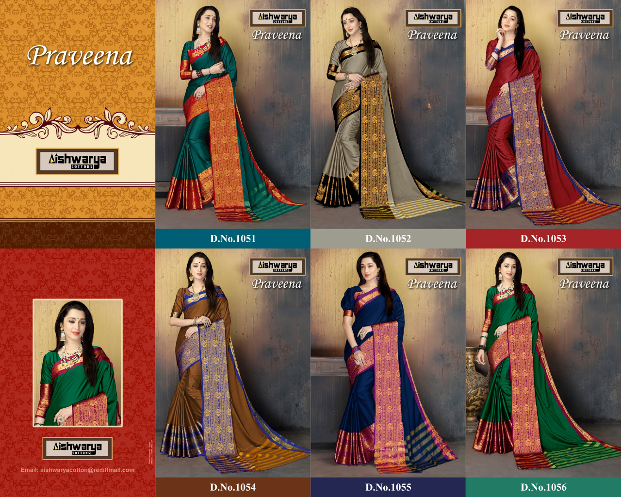 Buy Online Aishwarya Cottons Praveena 1051 Series Cotton Saree Dealer 6 Pcs of Full Catalogue at Wholesale Price. Looking for Aishwarya Cottons Praveena 1051 Series Cotton Saree Dealer Full Catalouge at Best Price? Buy Now Aishwarya Cottons Praveena 1051 Series Cotton Saree Dealer at Wholesale Rate of Rs 4380 with Total 6 Pcs from authroized dealer and supplier of Aishwarya cottons Brand. Cost of Each piece is just only Rs 730 which is very low and affordable price to resale the product in your retail store ,This is Surat based Wholesale Supplier & Dealer of Aishwarya cottons Brand. Click on Brand name to Know more about Aishwarya cottons Brand's products.Call or Whatsapp on 9898838984 for booking or enquiry