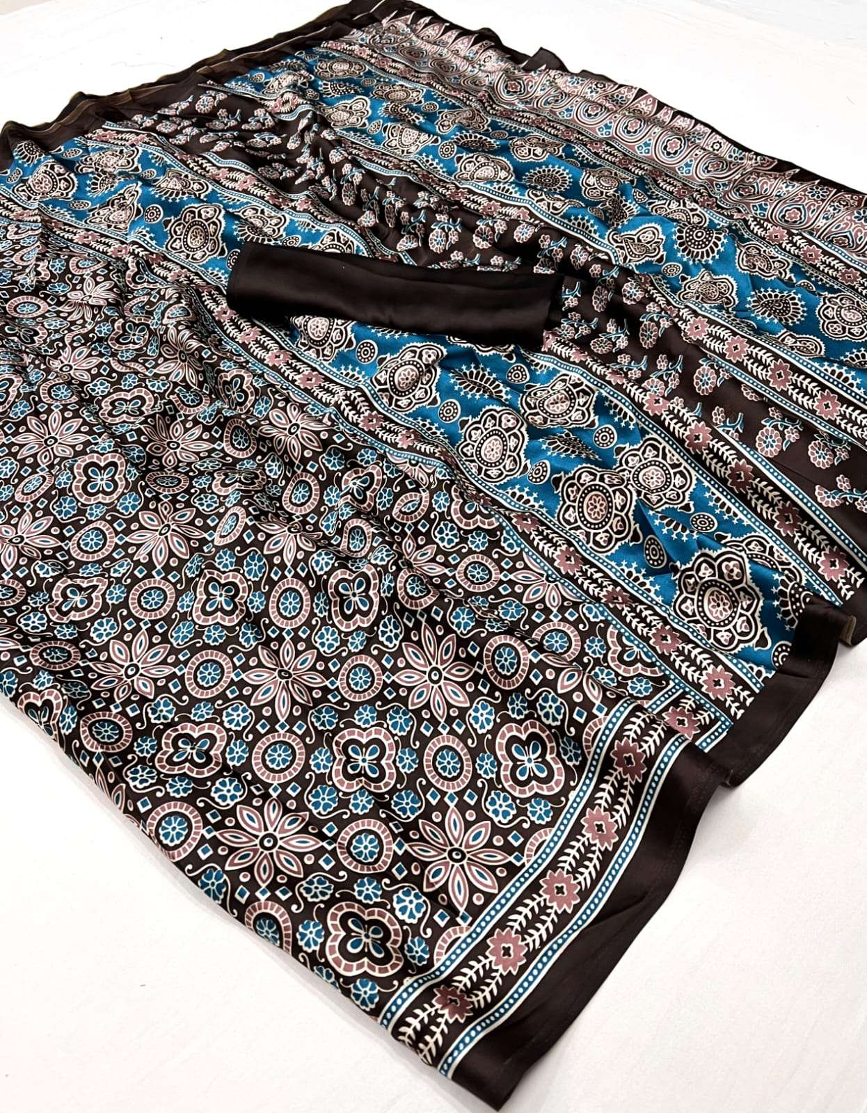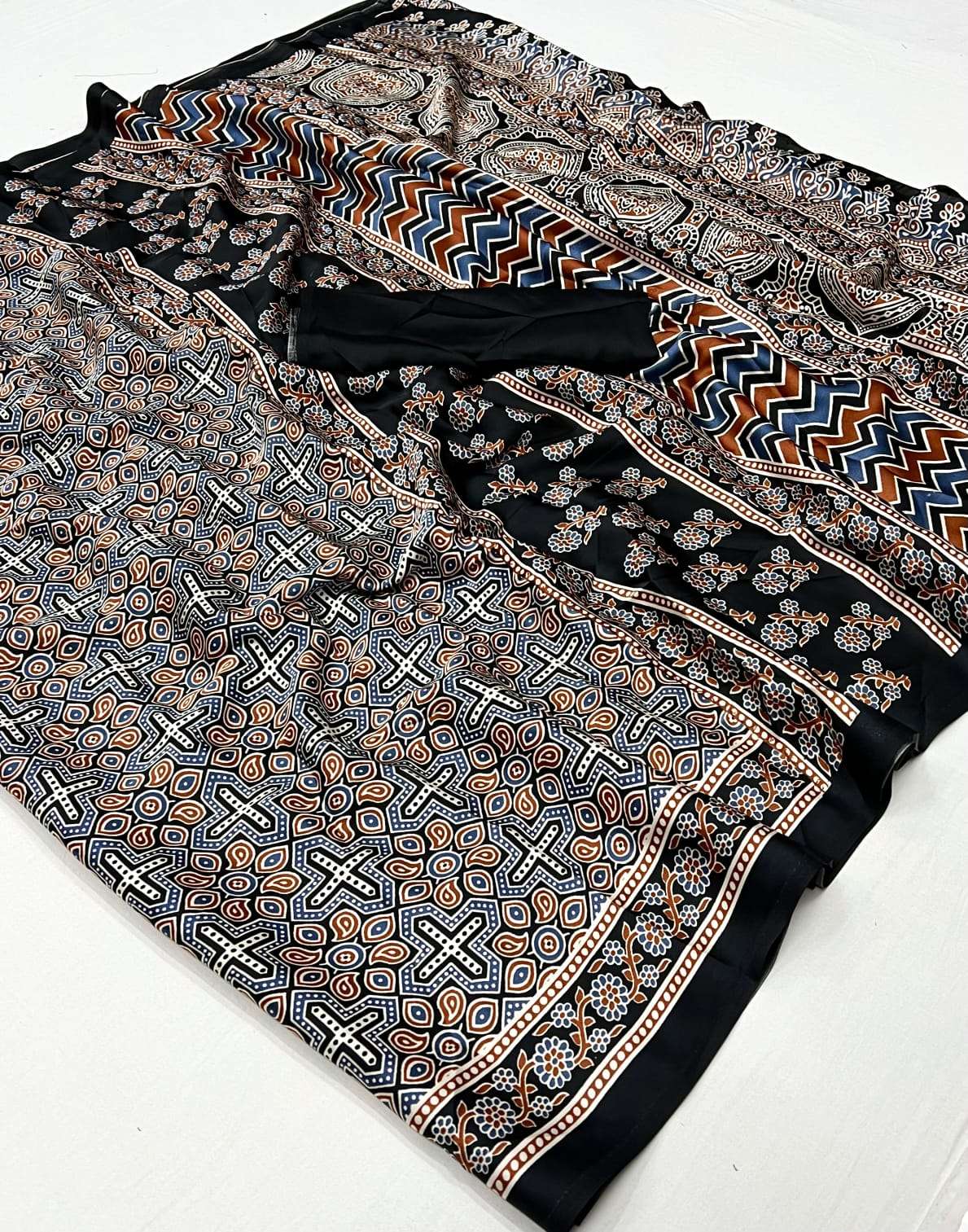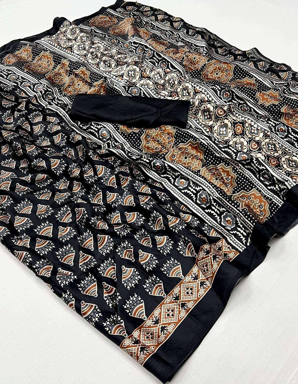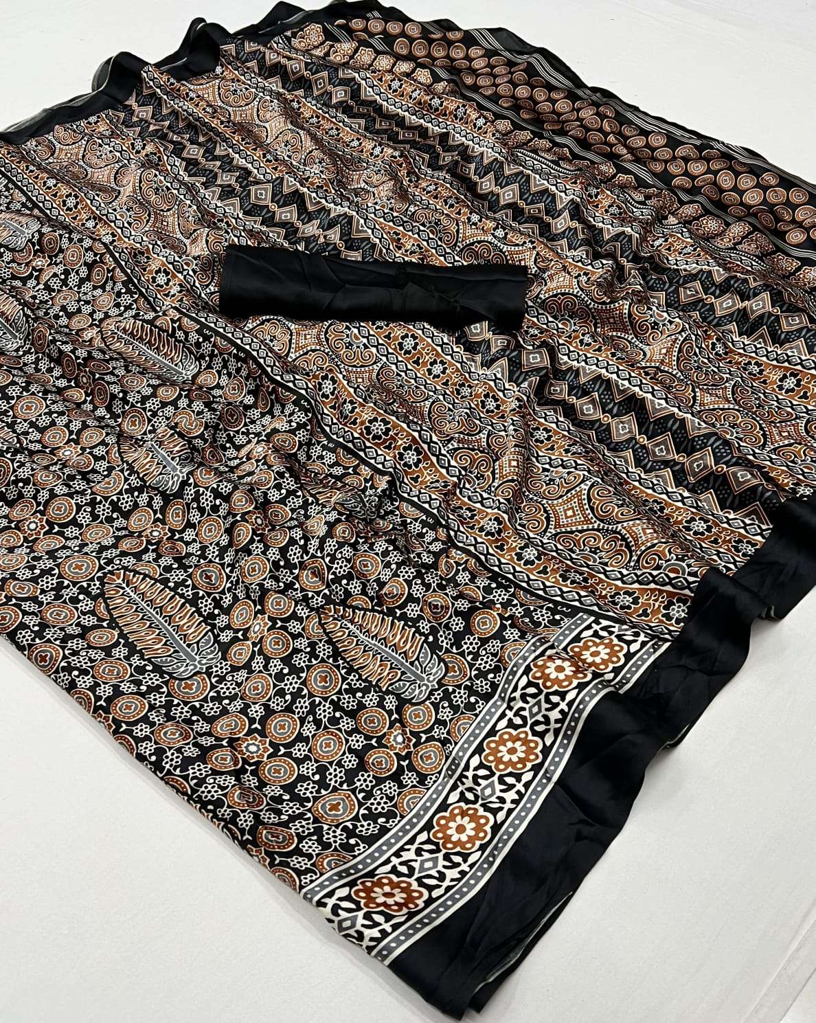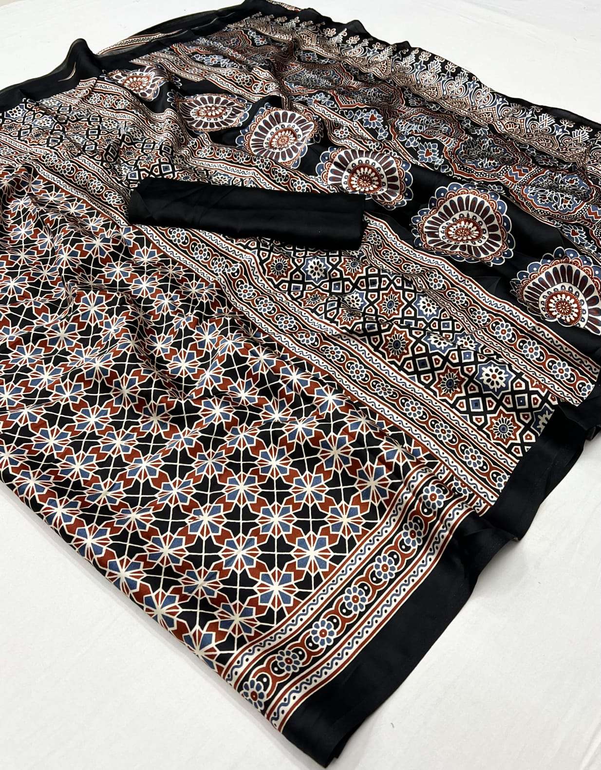 Fabric - *Printed Ajarakh Satin Crepe Saree*