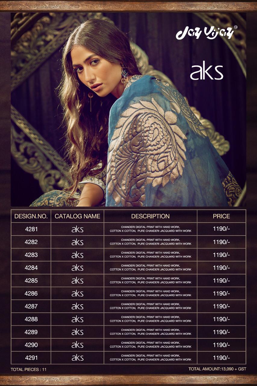 Buy Online Aks By Jay Vijay 4281 Series Fancy Chanderi Digital Printed Salwar Kameez Catlog Wholesale Dealer Surat 11 Pcs of Full Catalogue at Wholesale Price. Looking for Aks By Jay Vijay 4281 Series Fancy Chanderi Digital Printed Salwar Kameez Catlog Wholesale Dealer Surat Full Catalouge at Best Price? Buy Now Aks By Jay Vijay 4281 Series Fancy Chanderi Digital Printed Salwar Kameez Catlog Wholesale Dealer Surat at Wholesale Rate of Rs 13090 with Total 11 Pcs from authroized dealer and supplier of JAY VIJAY Brand. Cost of Each piece is just only Rs 1190 which is very low and affordable price to resale the product in your retail store ,This is Surat based Wholesale Supplier & Dealer of JAY VIJAY Brand. Click on Brand name to Know more about JAY VIJAY Brand's products.Call or Whatsapp on 9898838984 for booking or enquiry