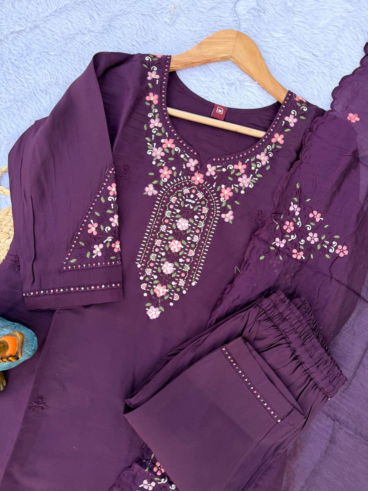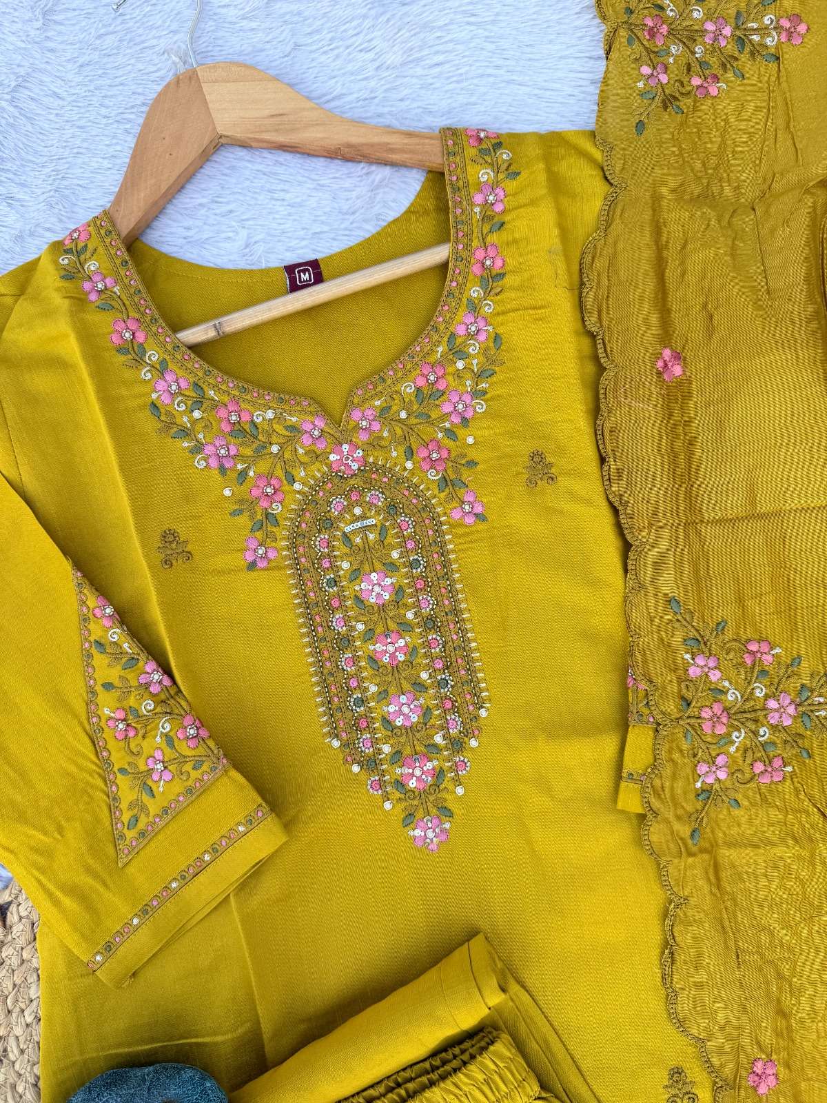 👉 *Pant (Stitched)* 👇 Fabric :- Roman Silk Work :- Multi Embroidery Thread Fit :- Straight-Cut Pant for a sleek look Length: 38”