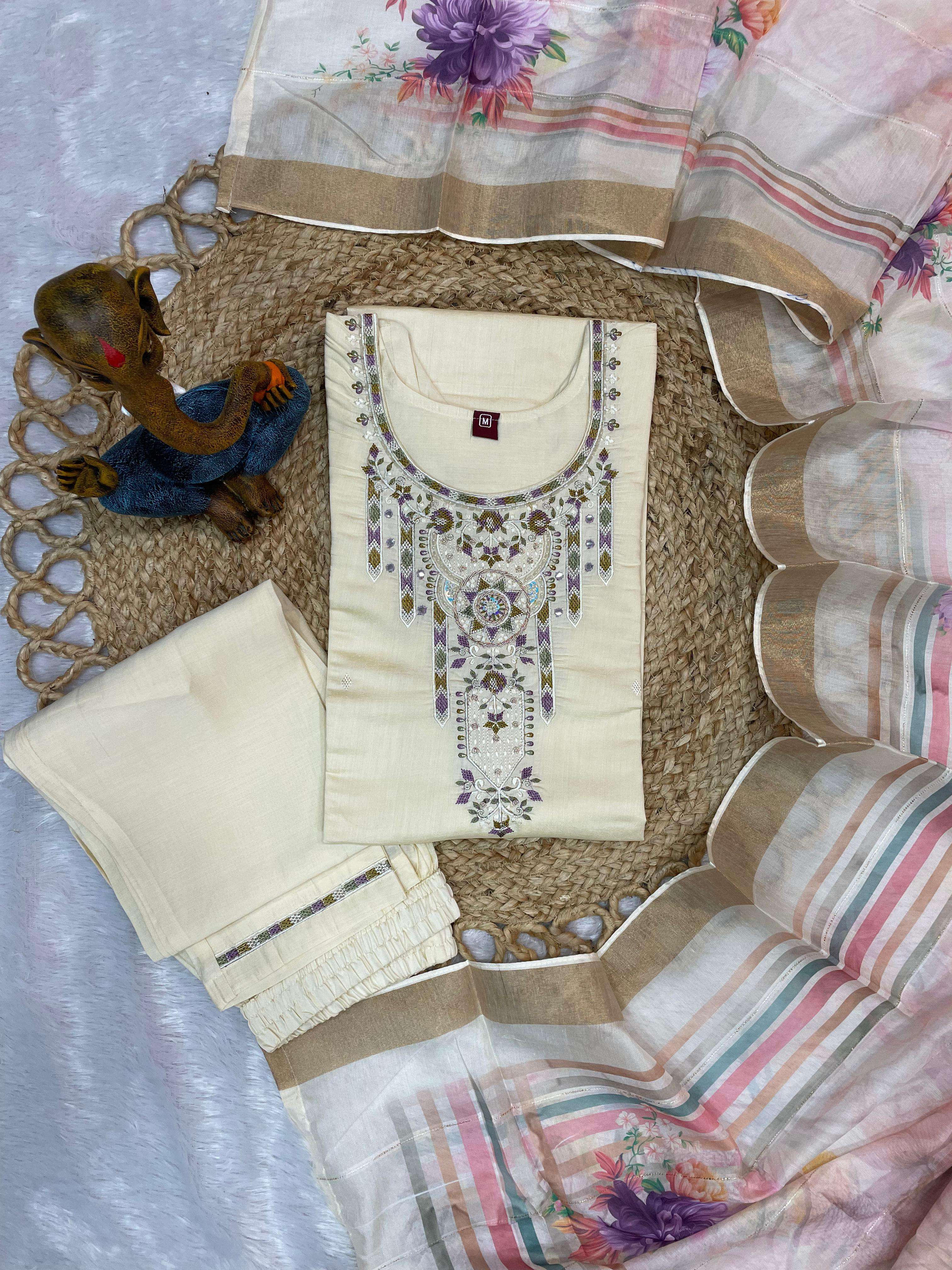 *Pant (Stitched)* Fabric :- Shimmer Gold Silk Work :- Multi Embroidery Thread Fit :- Straight-Cut Pant for a sleek look Length: 38”