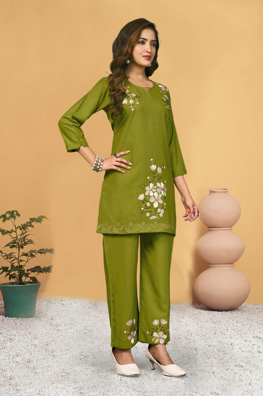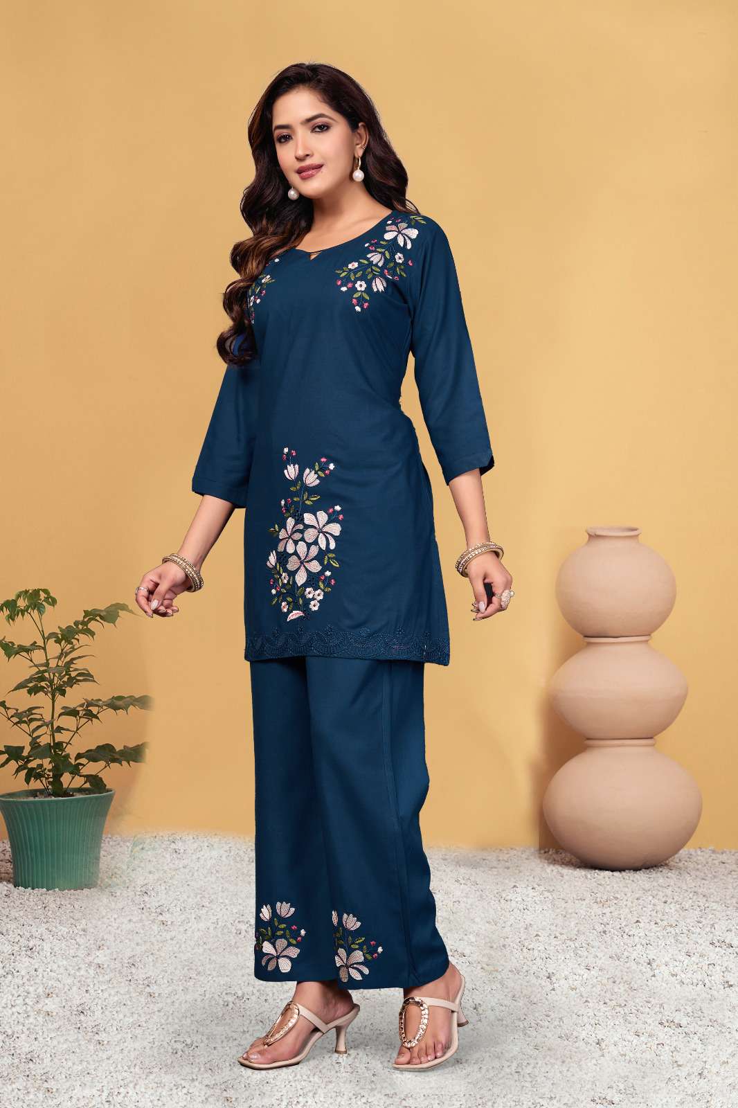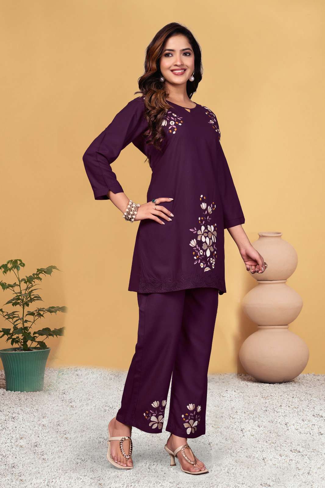 *AL-132* *Co-Ords Set (Stitched)* Fabric :- Heavy viscose Rayon Work :- Multi Embroidery Thread Work Chest Size :- M(40”), L(42”), XL(44”), 2XL(46”), 3XL(48) Length :- 31” Sleeve Length :- 16”