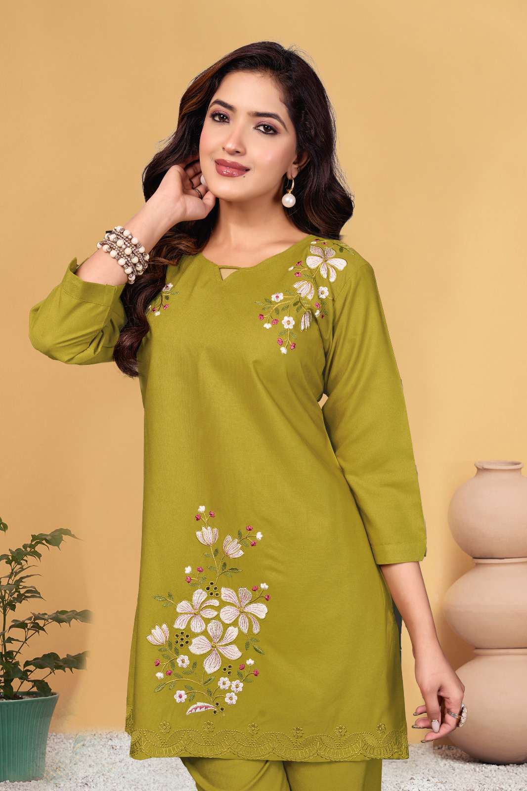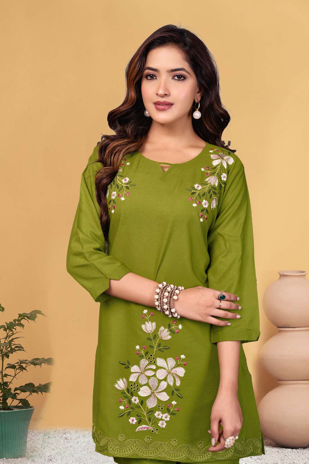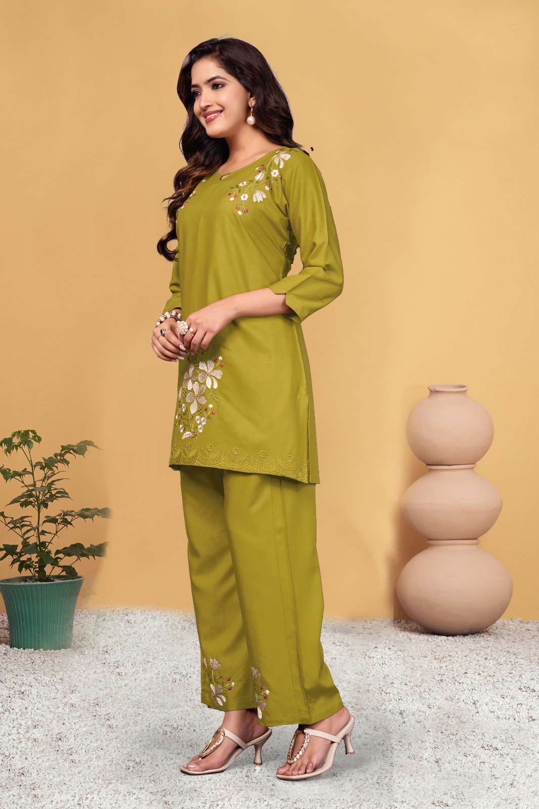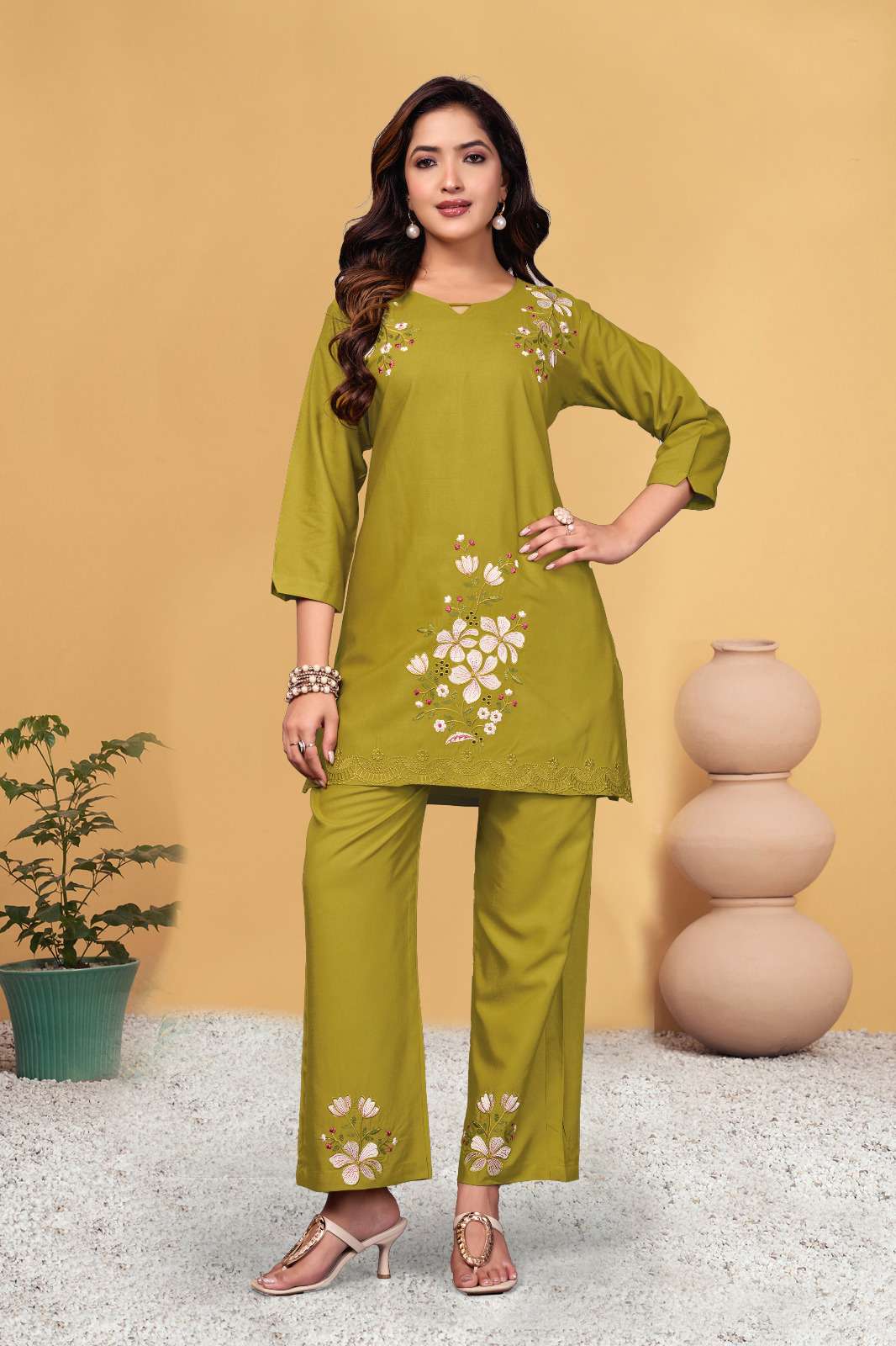 *AL-132* *Co-Ords Set (Stitched)* Fabric :- Heavy viscose Rayon Work :- Multi Embroidery Thread Work Chest Size :- M(40”), L(42”), XL(44”), 2XL(46”), 3XL(48) Length :- 31” Sleeve Length :- 16”