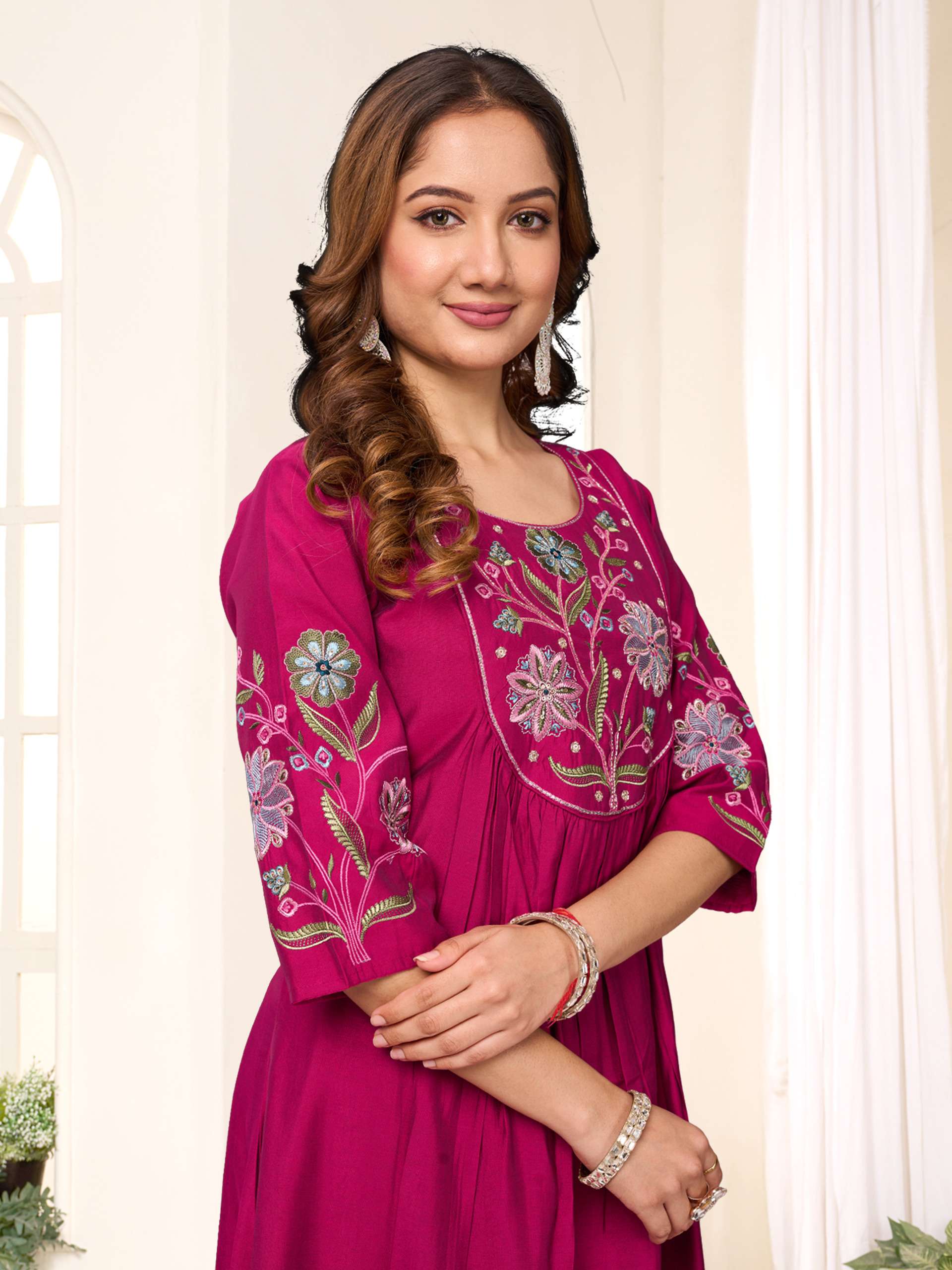 👉🏻*Anarkali Kurti* (*Stitched*) Fabric :- Viscose Roman Silk Work :- Multi Embroidery Thread With Hand Work Chest Size :- M(38”),L(40”),XL(42”),2XL(44”),3Xl(46”) Length :- 46” Sleeve Length :- 16” Kurti Flair :- 3 MTR