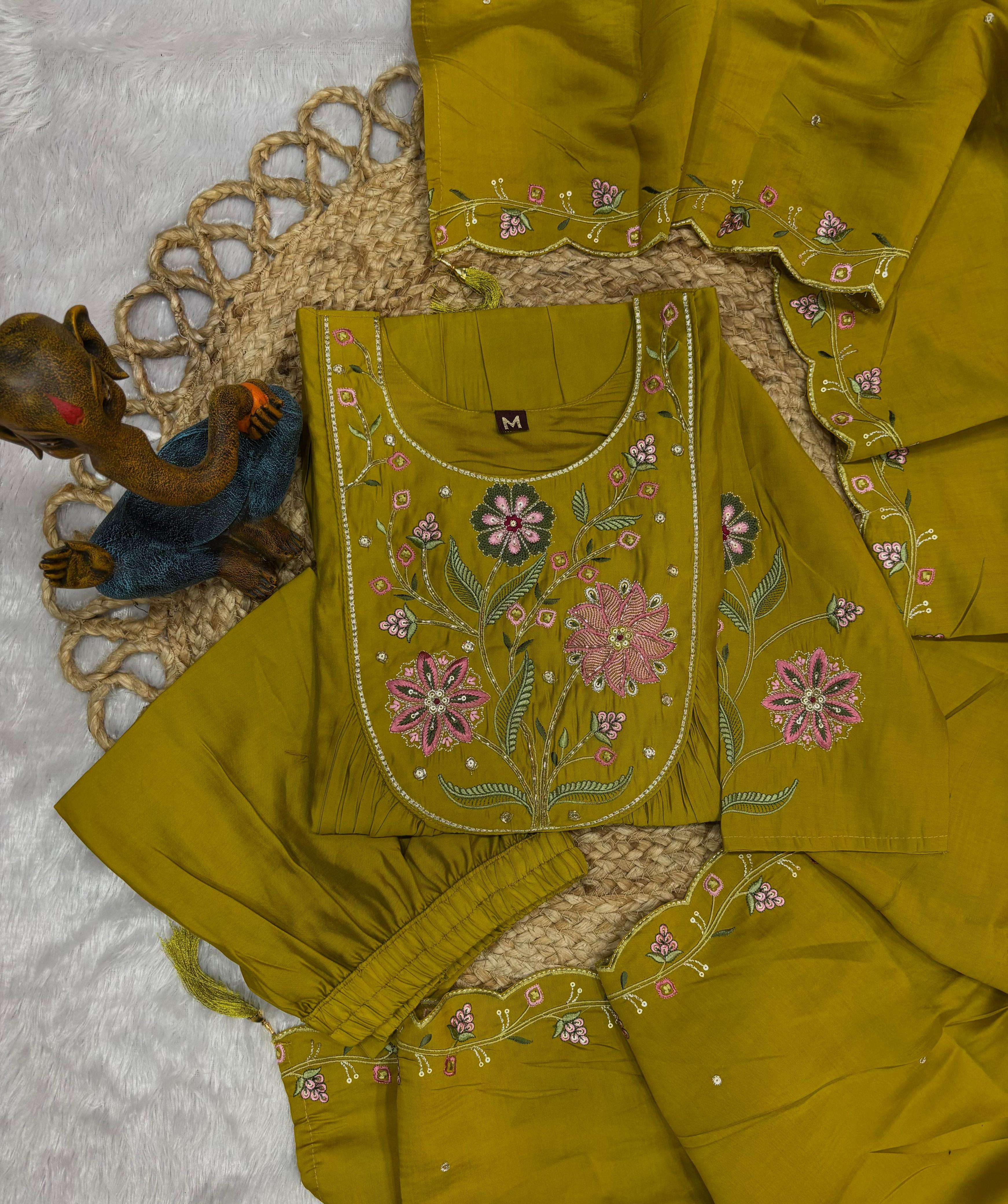 👉🏻*Dupatta* Fabric :- Heavy Chanderi Silk Work :- Heavy Embroidery Work With Border Cut Work. Length :- 2.20 Meter Package Contains :- Kurti, Pant, Dupatta Weight: 0.650 kg