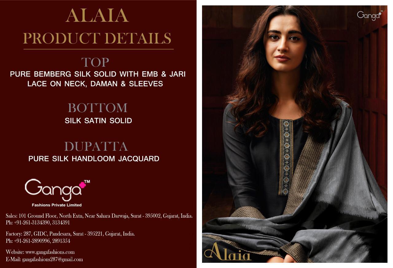 *Ganga* _presents_ Â?Â?Â? *Alaia* Â?Â?Â?Â? *TOP* ```Pure bemberg silk solid with embroidery and jari lace on neck , daman and sleeves``` *BOTTOM* ```Silk satin solid``` *DUPATTA* ```Pure silk Handloom jacquard``` _____________ ```Rate-2065?``` ```Designs-08``` ```Set amount-16520?``` Â?Â?Â?Â?Â?Â? 5%Gst Applicable Set to set Delivery 2 Days |