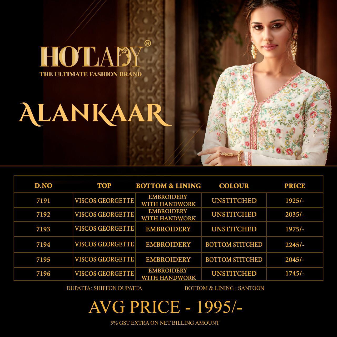 Buy Online Alankar By Hotlady Series 7191 To 7196 Designer Party Wear Suits Wholesale Supplier Nd Dealer Gujarat 6 Pcs of Full Catalogue at Wholesale Price. Looking for Alankar By Hotlady Series 7191 To 7196 Designer Party Wear Suits Wholesale Supplier Nd Dealer Gujarat Full Catalouge at Best Price? Buy Now Alankar By Hotlady Series 7191 To 7196 Designer Party Wear Suits Wholesale Supplier Nd Dealer Gujarat at Wholesale Rate of Rs 11970 with Total 6 Pcs from authroized dealer and supplier of HOTLADY Brand. Cost of Each piece is just only Rs 1995 which is very low and affordable price to resale the product in your retail store ,This is Surat based Wholesale Supplier & Dealer of HOTLADY Brand. Click on Brand name to Know more about HOTLADY Brand's products.Call or Whatsapp on 9898838984 for booking or enquiry