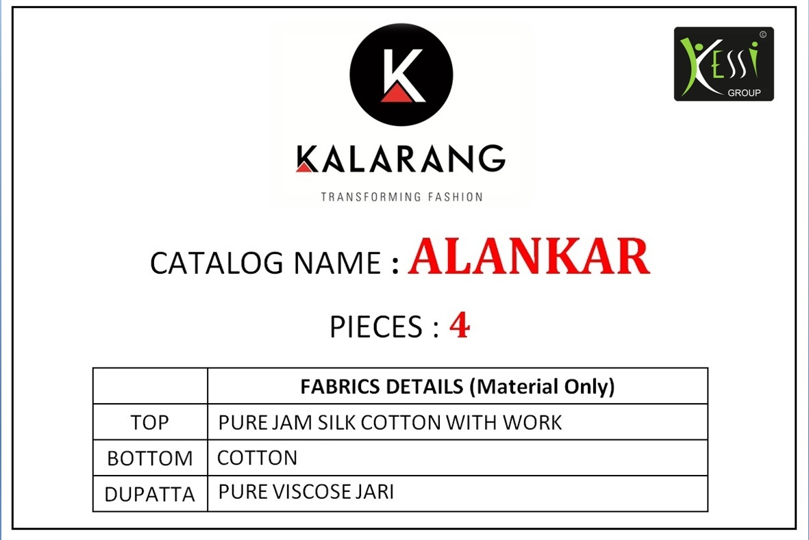 Buy Online Alankar By Kalarang Creation Series 101 To 104 Jam Silk Suits Wholesale Dealer And Supplier Surat 4 Pcs of Full Catalogue at Wholesale Price. Looking for Alankar By Kalarang Creation Series 101 To 104 Jam Silk Suits Wholesale Dealer And Supplier Surat Full Catalouge at Best Price? Buy Now Alankar By Kalarang Creation Series 101 To 104 Jam Silk Suits Wholesale Dealer And Supplier Surat at Wholesale Rate of Rs 3796 with Total 4 Pcs from authroized dealer and supplier of KESSI Brand. Cost of Each piece is just only Rs 949 which is very low and affordable price to resale the product in your retail store ,This is Surat based Wholesale Supplier & Dealer of KESSI Brand. Click on Brand name to Know more about KESSI Brand's products.Call or Whatsapp on 9898838984 for booking or enquiry