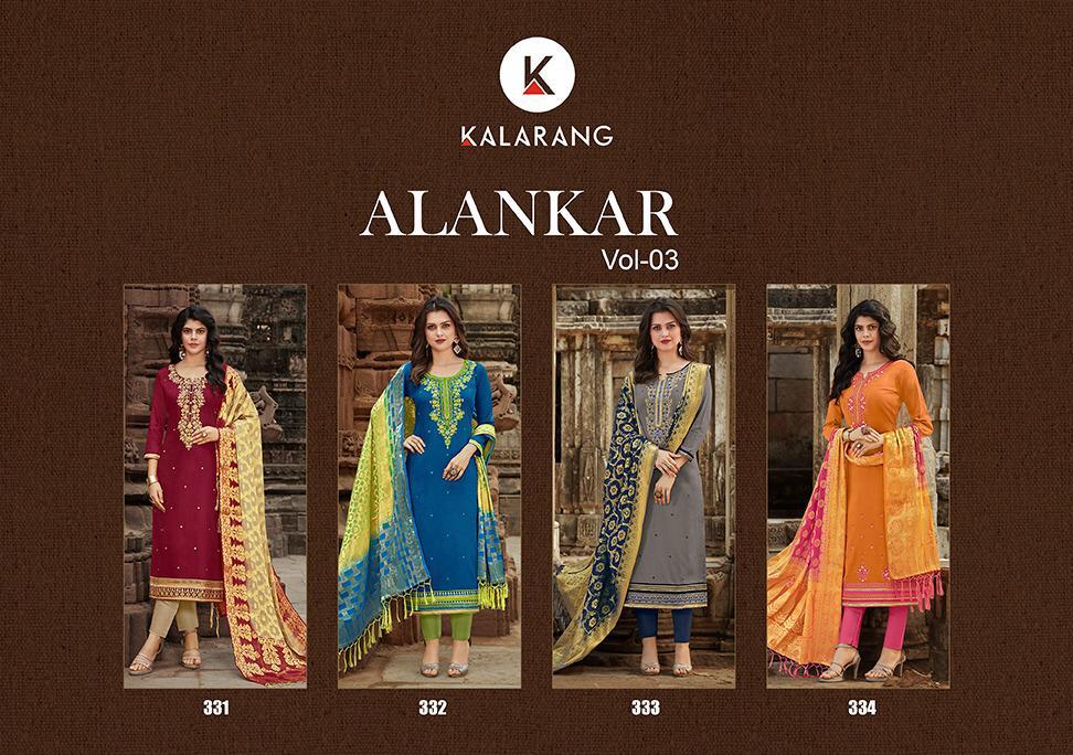 Buy Online Alankar Vol 3 By Kalarang 331 Series Fancy Jam Silk Cotton Embroidery Salwar Kameez Catlog Wholesale Dealer Surat 4 Pcs of Full Catalogue at Wholesale Price. Looking for Alankar Vol 3 By Kalarang 331 Series Fancy Jam Silk Cotton Embroidery Salwar Kameez Catlog Wholesale Dealer Surat Full Catalouge at Best Price? Buy Now Alankar Vol 3 By Kalarang 331 Series Fancy Jam Silk Cotton Embroidery Salwar Kameez Catlog Wholesale Dealer Surat at Wholesale Rate of Rs 3796 with Total 4 Pcs from authroized dealer and supplier of KALARANG Brand. Cost of Each piece is just only Rs 949 which is very low and affordable price to resale the product in your retail store ,This is Surat based Wholesale Supplier & Dealer of KALARANG Brand. Click on Brand name to Know more about KALARANG Brand's products.Call or Whatsapp on 9898838984 for booking or enquiry