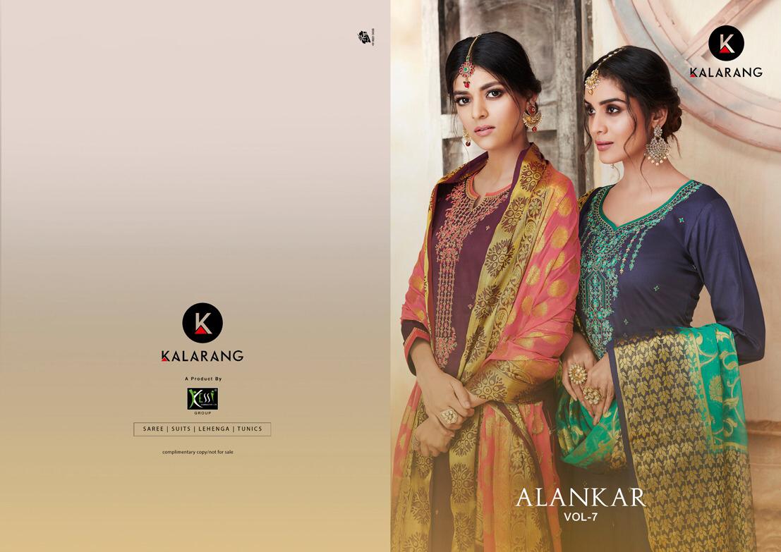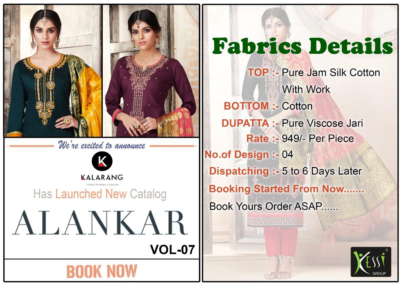 Buy Online Alankar Vol 7 By Kalarang Jam Silk Cotton Suits Wholesale Supplier And Dealer India 4 Pcs of Full Catalogue at Wholesale Price. Looking for Alankar Vol 7 By Kalarang Jam Silk Cotton Suits Wholesale Supplier And Dealer India Full Catalouge at Best Price? Buy Now Alankar Vol 7 By Kalarang Jam Silk Cotton Suits Wholesale Supplier And Dealer India at Wholesale Rate of Rs 3796 with Total 4 Pcs from authroized dealer and supplier of KALARANG Brand. Cost of Each piece is just only Rs 949 which is very low and affordable price to resale the product in your retail store ,This is Surat based Wholesale Supplier & Dealer of KALARANG Brand. Click on Brand name to Know more about KALARANG Brand's products.Call or Whatsapp on 9898838984 for booking or enquiry