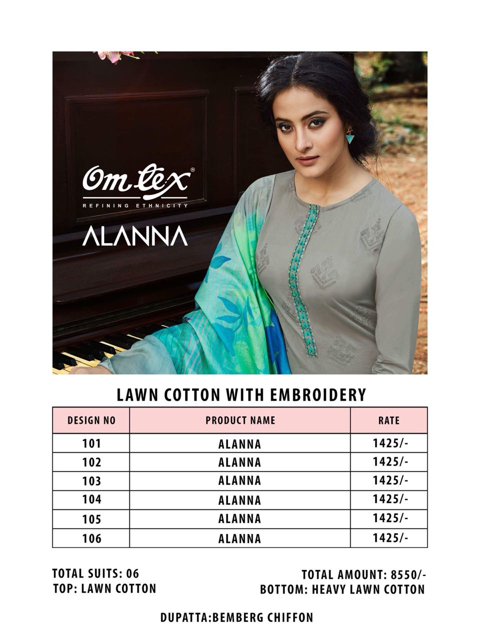 Buy Online Alanna By Omtex Pure Cotton Embroidered Suits Wholesale Supplier And Dealer Surat 6 Pcs of Full Catalogue at Wholesale Price. Looking for Alanna By Omtex Pure Cotton Embroidered Suits Wholesale Supplier And Dealer Surat Full Catalouge at Best Price? Buy Now Alanna By Omtex Pure Cotton Embroidered Suits Wholesale Supplier And Dealer Surat at Wholesale Rate of Rs 8550 with Total 6 Pcs from authroized dealer and supplier of OM TEX Brand. Cost of Each piece is just only Rs 1425 which is very low and affordable price to resale the product in your retail store ,This is Surat based Wholesale Supplier & Dealer of OM TEX Brand. Click on Brand name to Know more about OM TEX Brand's products.Call or Whatsapp on 9898838984 for booking or enquiry