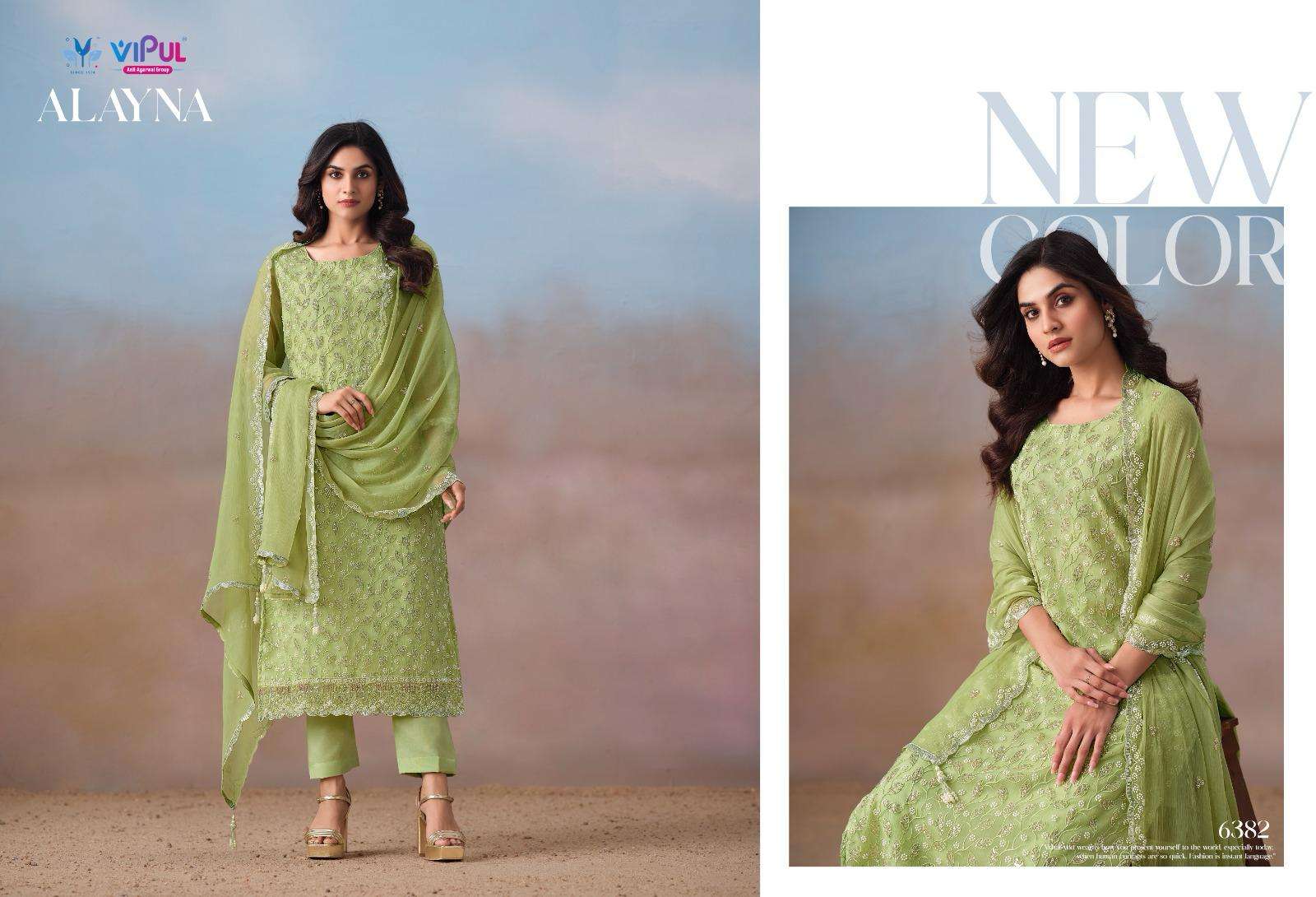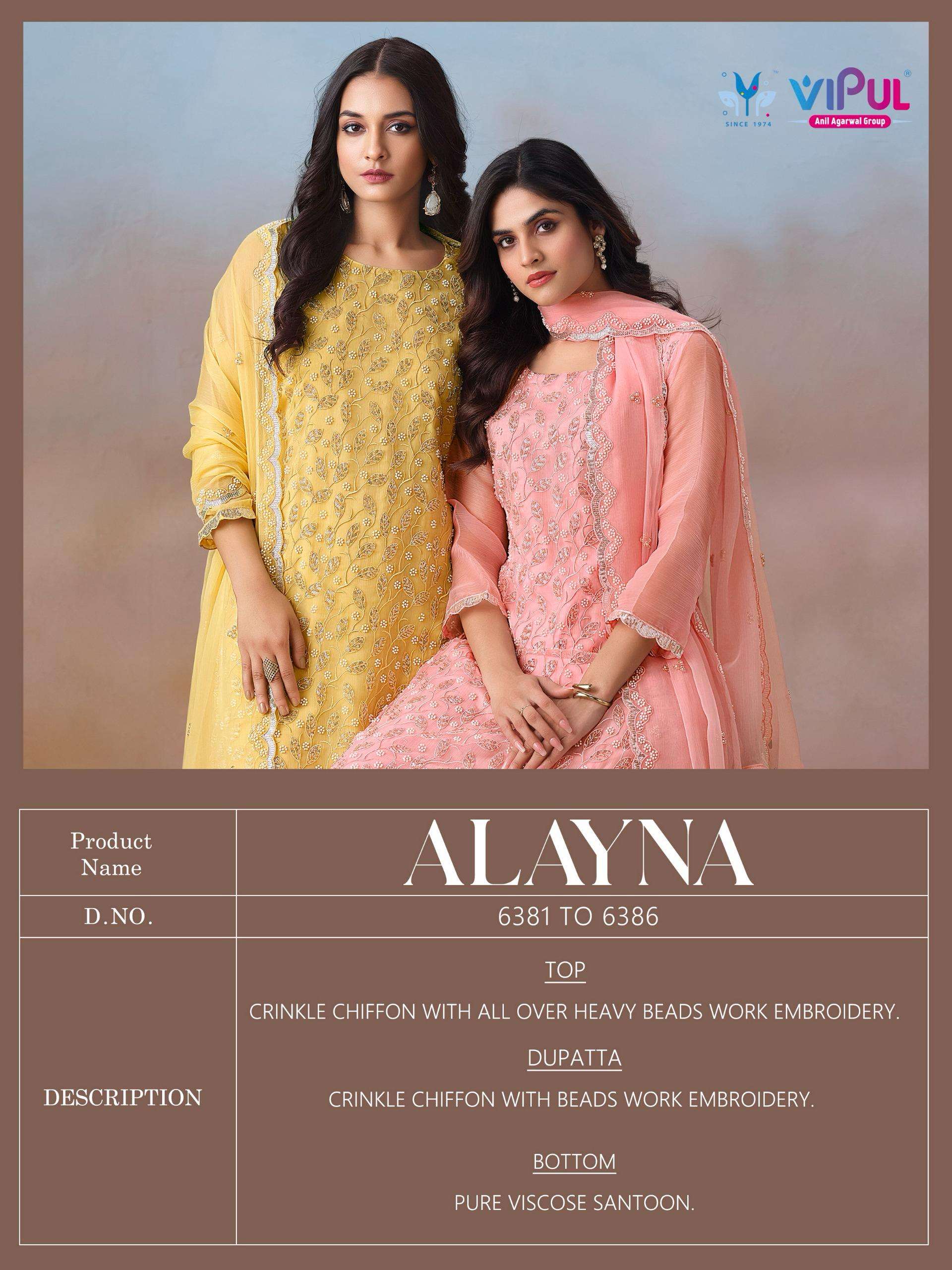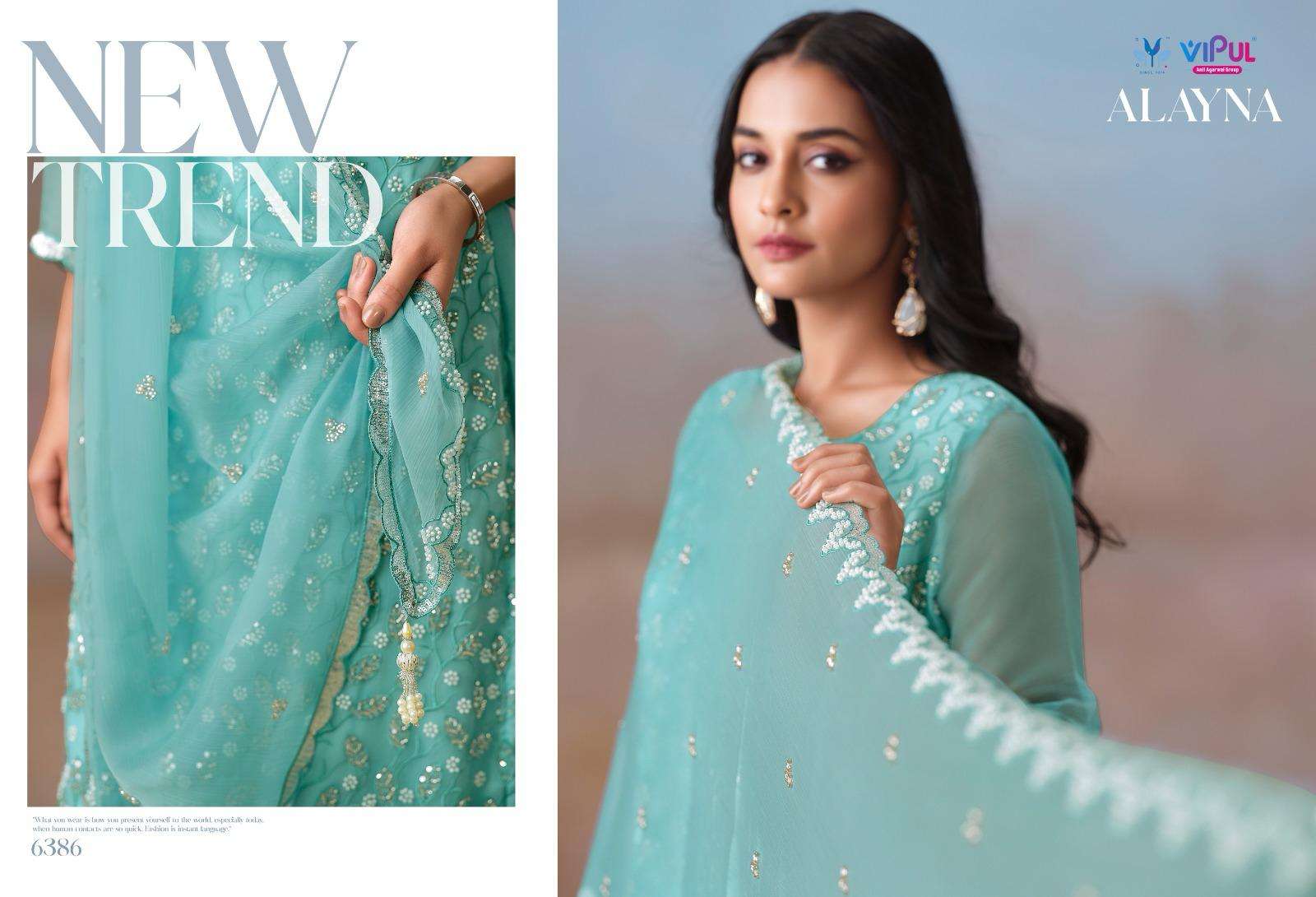 Buy Online Alayna by vipul chiffon suit collection manufacturer surat 6 Pcs of Full Catalogue at Wholesale Price. Looking for Alayna by vipul chiffon suit collection manufacturer surat Full Catalouge at Best Price? Buy Now Alayna by vipul chiffon suit collection manufacturer surat at Wholesale Rate of Rs 14166 with Total 6 Pcs from authroized dealer and supplier of VIPUL Brand. Cost of Each piece is just only Rs 2361 which is very low and affordable price to resale the product in your retail store ,This is Surat based Wholesale Supplier & Dealer of VIPUL Brand. Click on Brand name to Know more about VIPUL Brand's products.Call or Whatsapp on 9898838984 for booking or enquiry