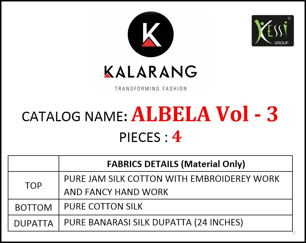 Buy Online Albela Vol 3 By Kalarang Jam Silk Cotton Embroidered Suits Wholesale Supplier Surat 4 Pcs of Full Catalogue at Wholesale Price. Looking for Albela Vol 3 By Kalarang Jam Silk Cotton Embroidered Suits Wholesale Supplier Surat Full Catalouge at Best Price? Buy Now Albela Vol 3 By Kalarang Jam Silk Cotton Embroidered Suits Wholesale Supplier Surat at Wholesale Rate of Rs 3996 with Total 4 Pcs from authroized dealer and supplier of KALARANG Brand. Cost of Each piece is just only Rs 999 which is very low and affordable price to resale the product in your retail store ,This is Surat based Wholesale Supplier & Dealer of KALARANG Brand. Click on Brand name to Know more about KALARANG Brand's products.Call or Whatsapp on 9898838984 for booking or enquiry