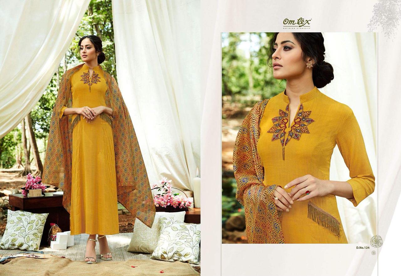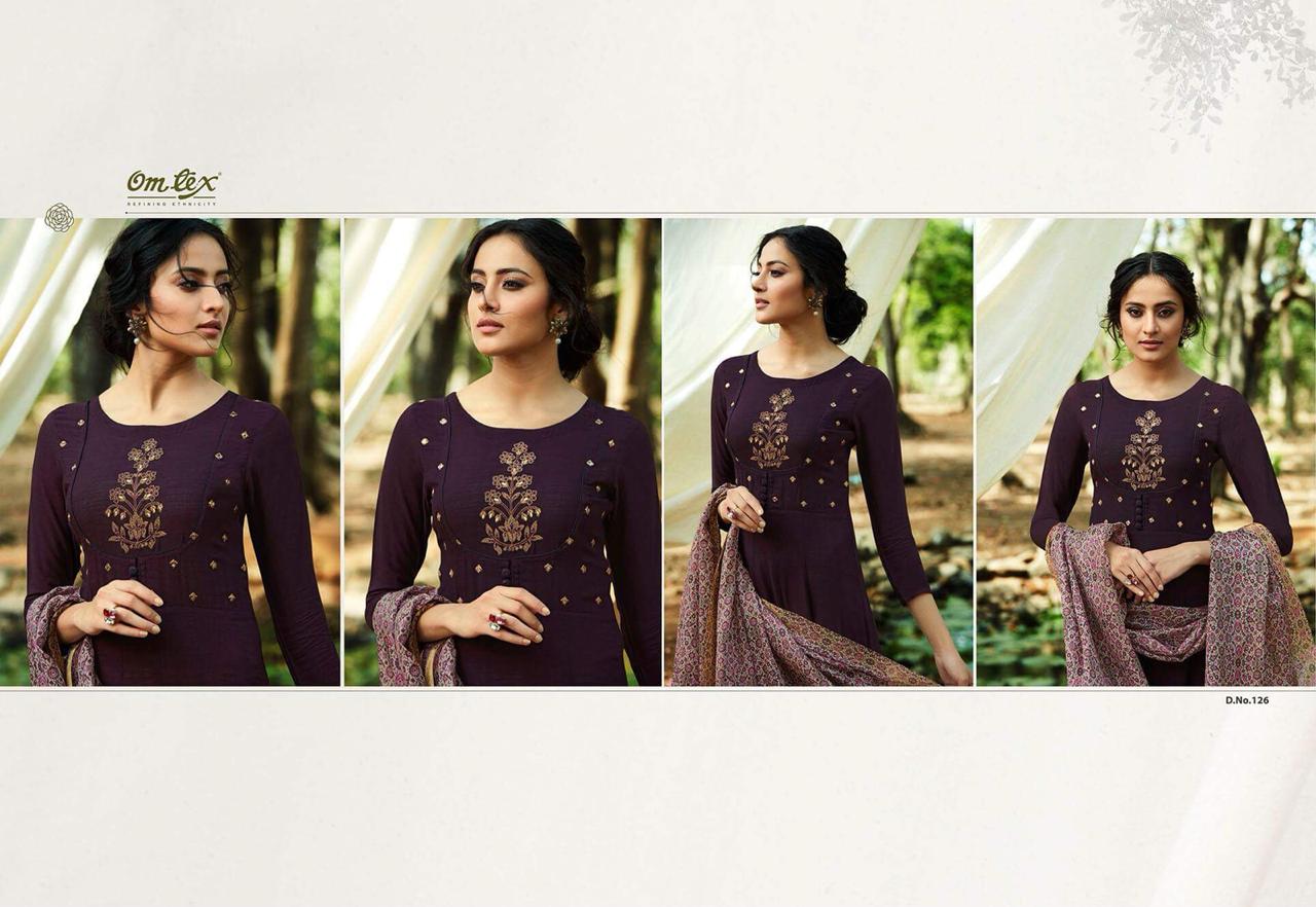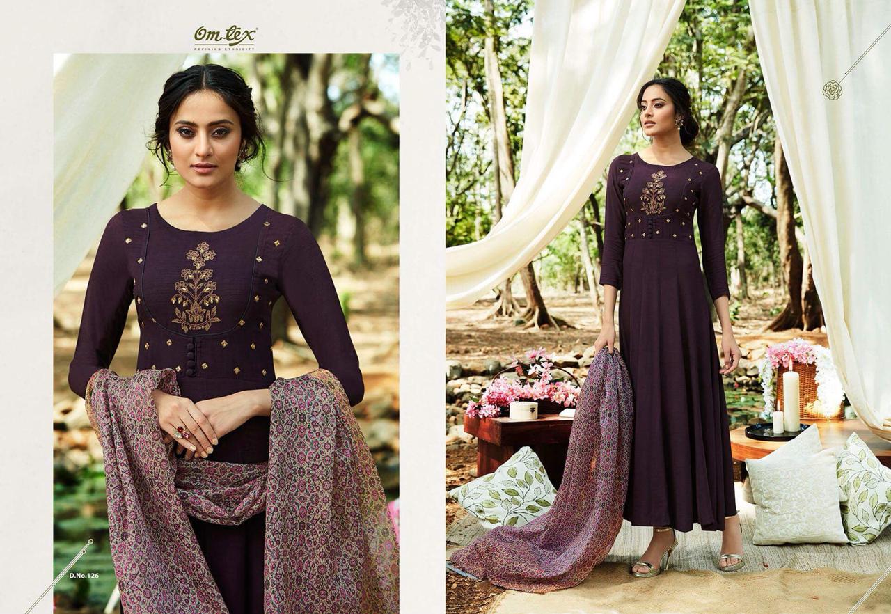 *Omtex* presents its latest long dress embroidered collection *ALENE* _Pure rayon slub with pure chanderi printed dupatta_ *Ratelist attached* 12%Gst applicable Set to set only Delivery 2-3 days |