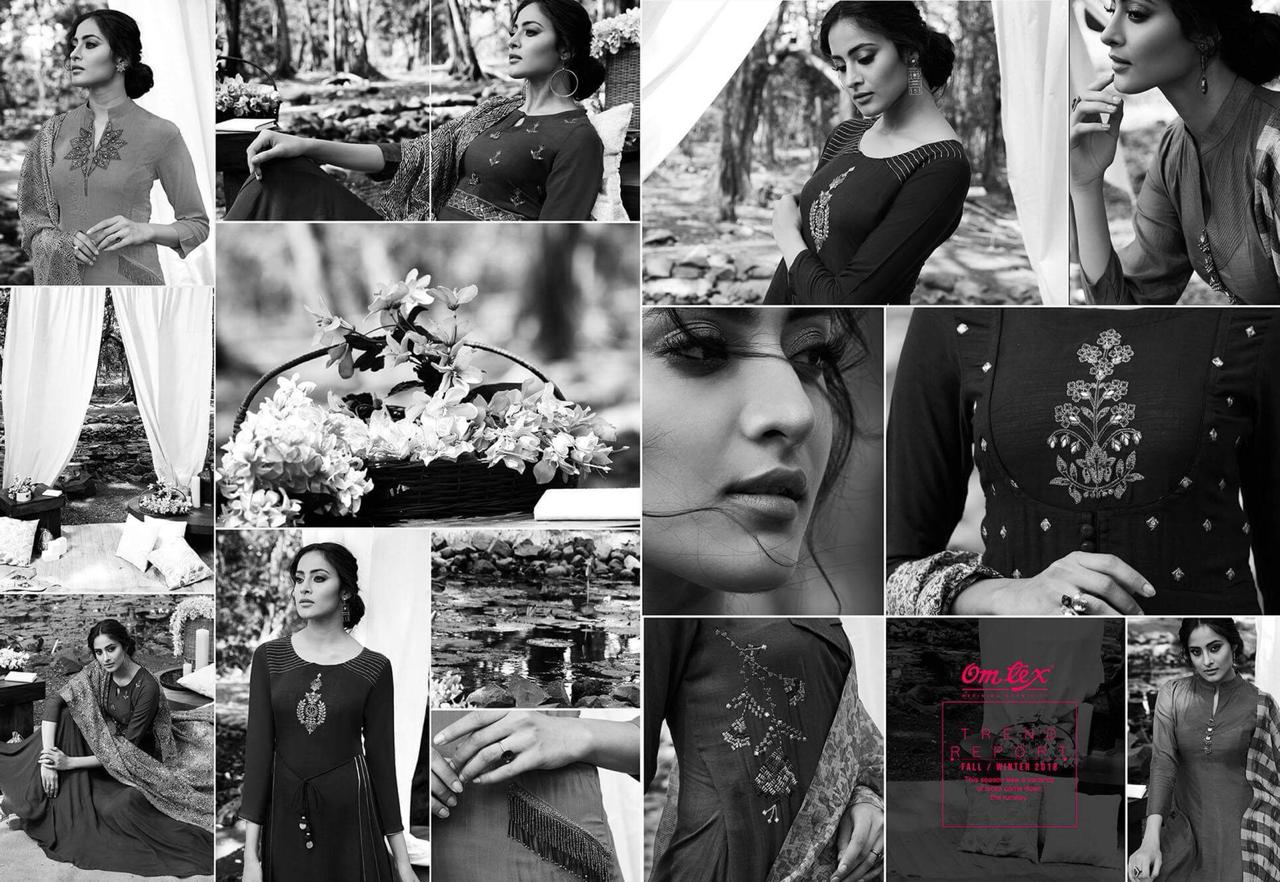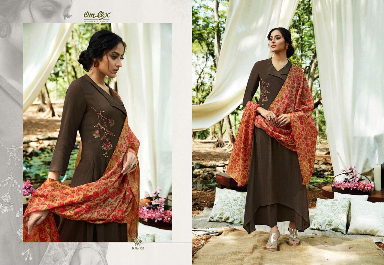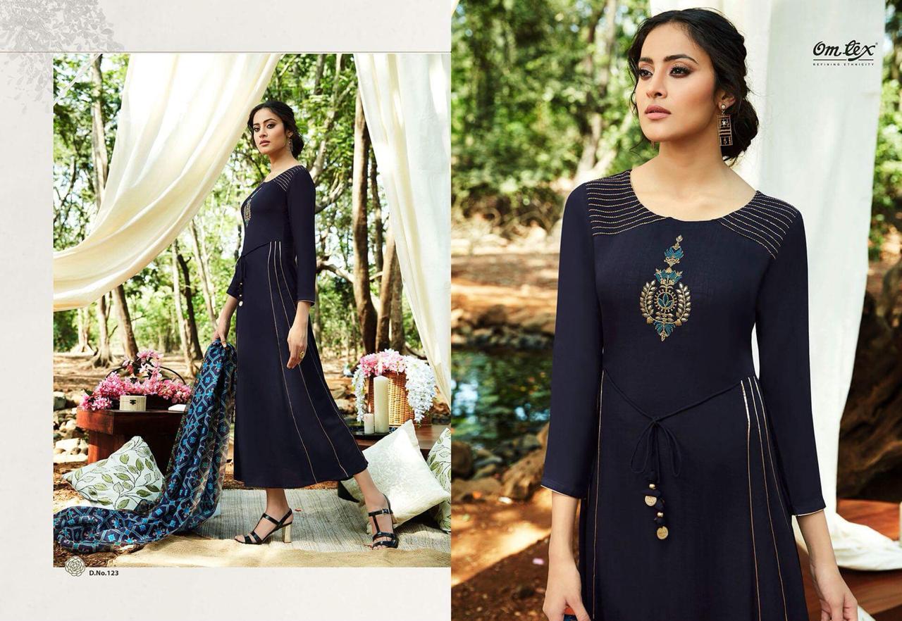 *Omtex* presents its latest long dress embroidered collection *ALENE* _Pure rayon slub with pure chanderi printed dupatta_ *Ratelist attached* 12%Gst applicable Set to set only Delivery 2-3 days |