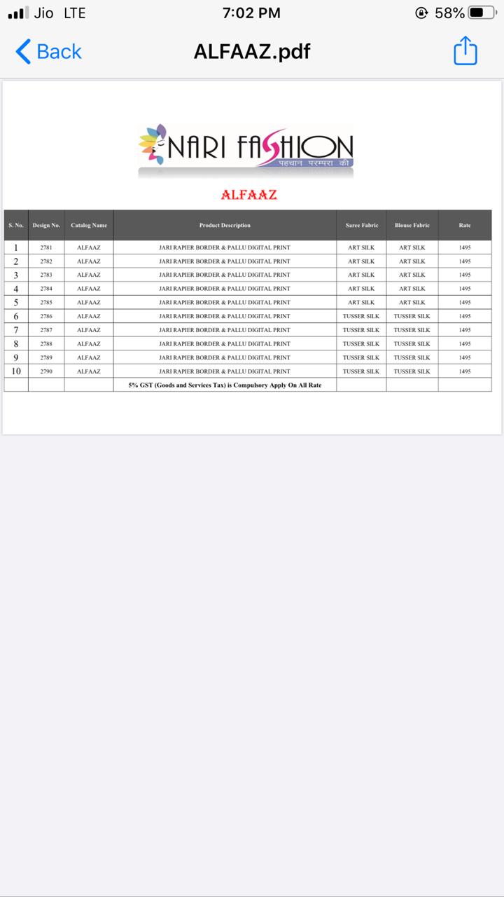 Brand - Nari . Type - saree. Catlog name -ALFAAZ. Set & loose & Singel. GST 5 Percent Extra. Delivery from today 100+ singles |