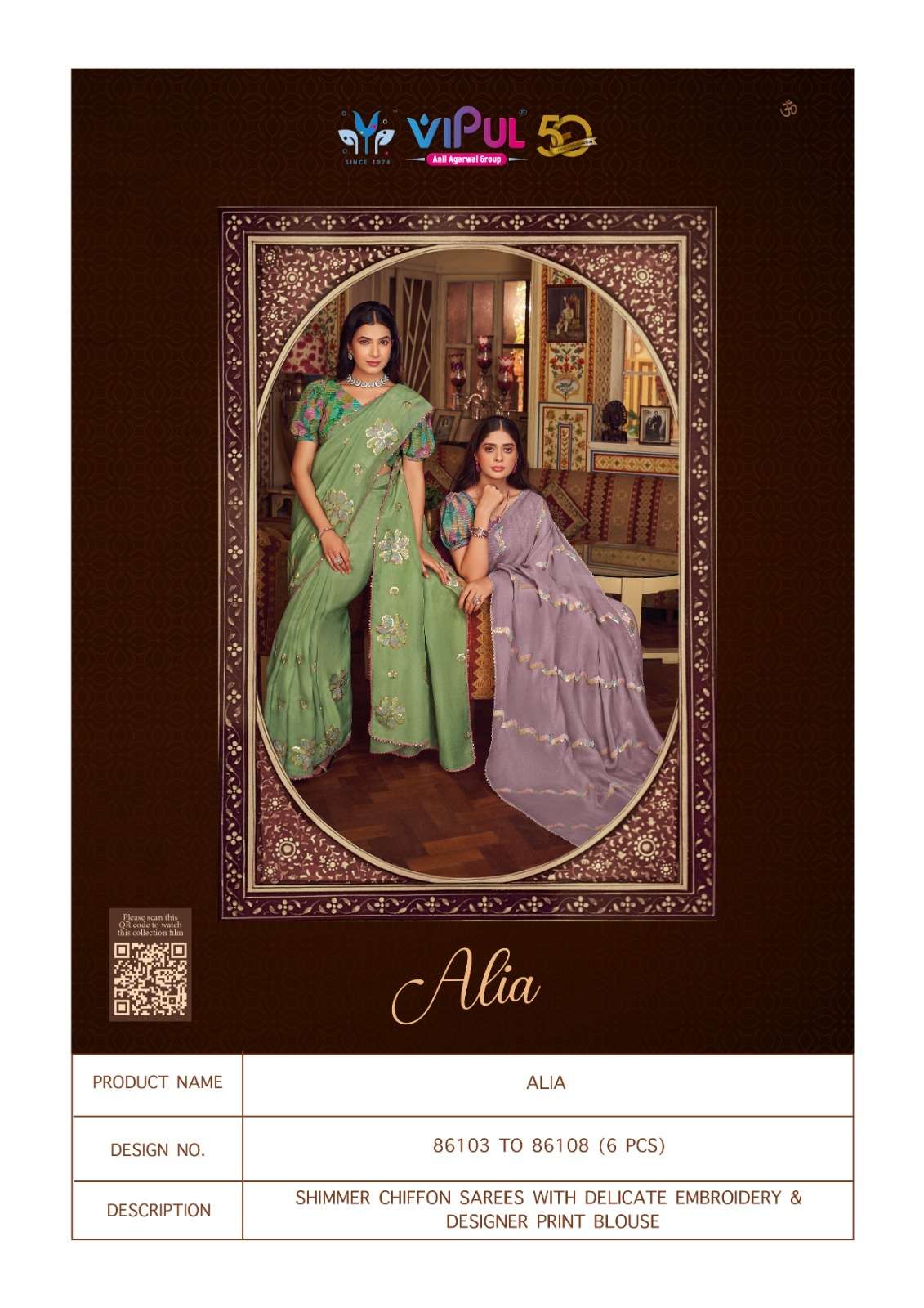 Buy Online ALIA by vipul chiffon saree collection manufacturer surat 6 Pcs of Full Catalogue at Wholesale Price. Looking for ALIA by vipul chiffon saree collection manufacturer surat Full Catalouge at Best Price? Buy Now ALIA by vipul chiffon saree collection manufacturer surat at Wholesale Rate of Rs 8682 with Total 6 Pcs from authroized dealer and supplier of VIPUL Brand. Cost of Each piece is just only Rs 1447 which is very low and affordable price to resale the product in your retail store ,This is Surat based Wholesale Supplier & Dealer of VIPUL Brand. Click on Brand name to Know more about VIPUL Brand's products.Call or Whatsapp on 9898838984 for booking or enquiry