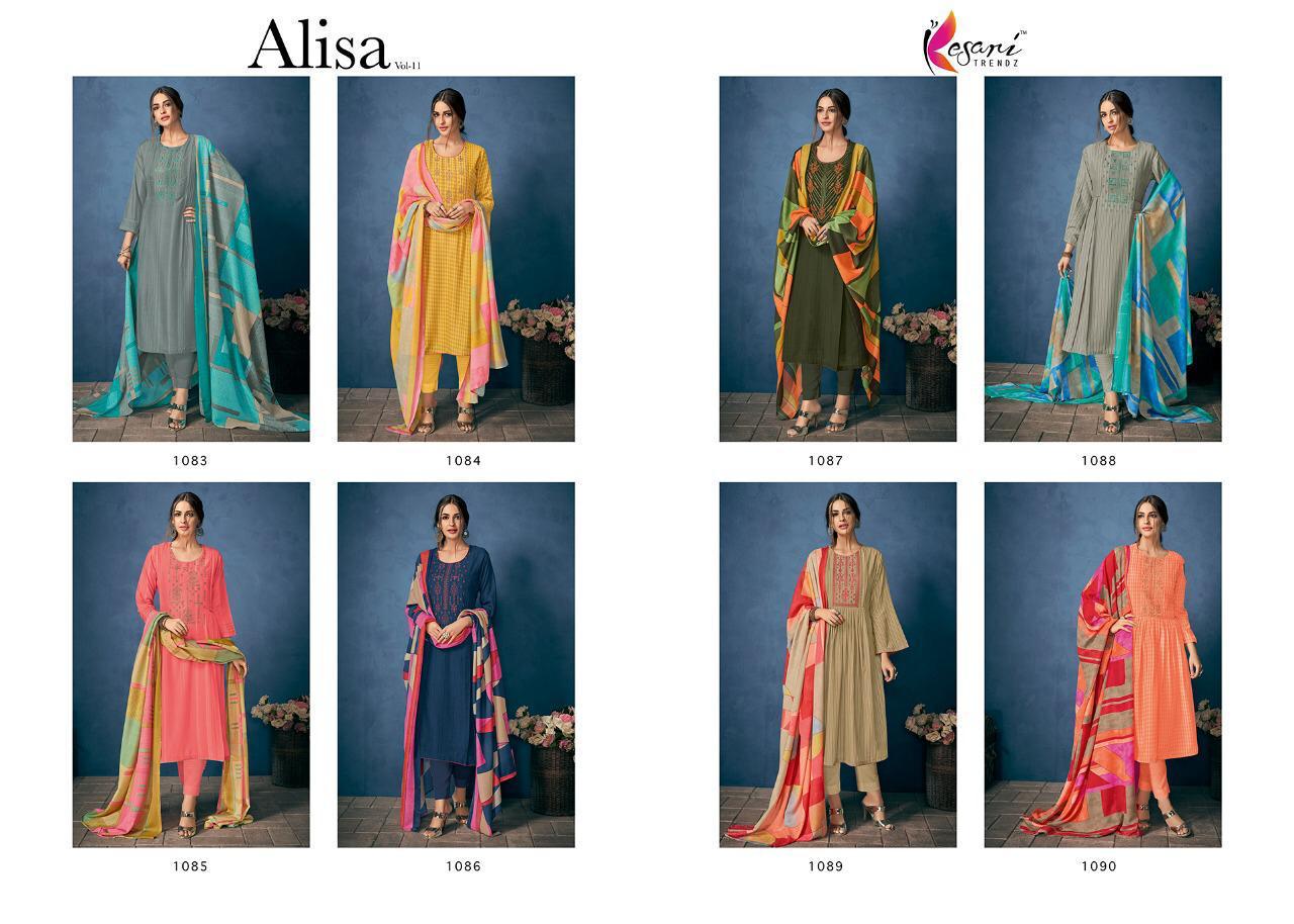 Buy Online Alisa Vol 11 By Kesari Trendz Masline Silk Embroidered Suits Wholesale Supplier And Dealer Surat 8 Pcs of Full Catalogue at Wholesale Price. Looking for Alisa Vol 11 By Kesari Trendz Masline Silk Embroidered Suits Wholesale Supplier And Dealer Surat Full Catalouge at Best Price? Buy Now Alisa Vol 11 By Kesari Trendz Masline Silk Embroidered Suits Wholesale Supplier And Dealer Surat at Wholesale Rate of Rs 5120 with Total 8 Pcs from authroized dealer and supplier of KESARI TRENDZ Brand. Cost of Each piece is just only Rs 640 which is very low and affordable price to resale the product in your retail store ,This is Surat based Wholesale Supplier & Dealer of KESARI TRENDZ Brand. Click on Brand name to Know more about KESARI TRENDZ Brand's products.Call or Whatsapp on 9898838984 for booking or enquiry