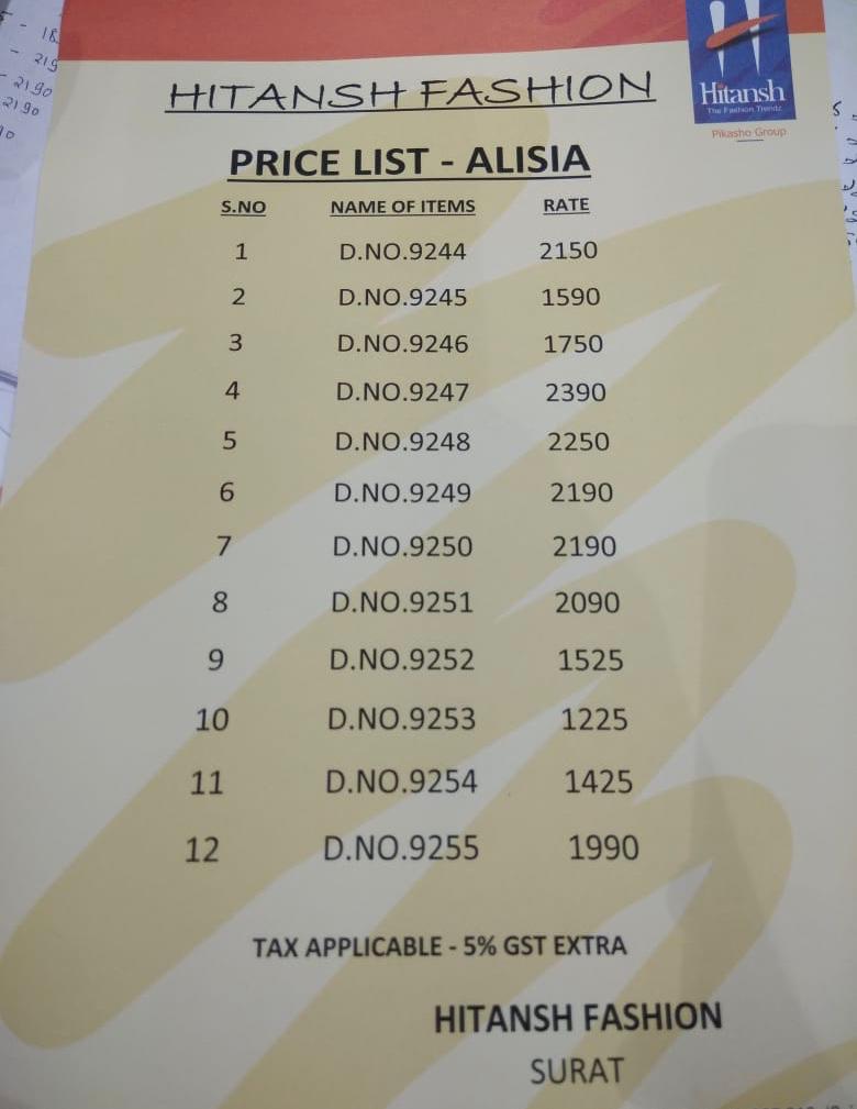 Brand - Hitansh . Catlog name - ALISIA . Set to set. GST 5 Percent Extra. Delivery 3-4 days . Book your order now |