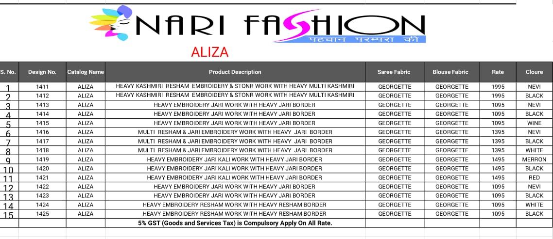 Buy Online Aliza By Nari 1411 To 1425 Series Fancy Designer Party Wear Saree Catlog Wholesale Dealer Surat 15 Pcs of Full Catalogue at Wholesale Price. Looking for Aliza By Nari 1411 To 1425 Series Fancy Designer Party Wear Saree Catlog Wholesale Dealer Surat Full Catalouge at Best Price? Buy Now Aliza By Nari 1411 To 1425 Series Fancy Designer Party Wear Saree Catlog Wholesale Dealer Surat at Wholesale Rate of Rs 0 with Total 15 Pcs from authroized dealer and supplier of Nari Fashion Brand. Cost of Each piece is just only Rs 0 which is very low and affordable price to resale the product in your retail store ,This is Surat based Wholesale Supplier & Dealer of Nari Fashion Brand. Click on Brand name to Know more about Nari Fashion Brand's products.Call or Whatsapp on 9898838984 for booking or enquiry