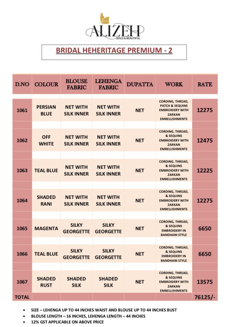 Buy Online Alizeh Official New Catalog Launch Bridal Heritage Premium Vol 2 Wedding Wear Lehangas Single Avilable Dealers Surat 7 Pcs of Full Catalogue at Wholesale Price. Looking for Alizeh Official New Catalog Launch Bridal Heritage Premium Vol 2 Wedding Wear Lehangas Single Avilable Dealers Surat Full Catalouge at Best Price? Buy Now Alizeh Official New Catalog Launch Bridal Heritage Premium Vol 2 Wedding Wear Lehangas Single Avilable Dealers Surat at Wholesale Rate of Rs 0 with Total 7 Pcs from authroized dealer and supplier of Brand. Cost of Each piece is just only Rs 0 which is very low and affordable price to resale the product in your retail store ,This is Surat based Wholesale Supplier & Dealer of Brand. Click on Brand name to Know more about Brand's products.Call or Whatsapp on 9898838984 for booking or enquiry