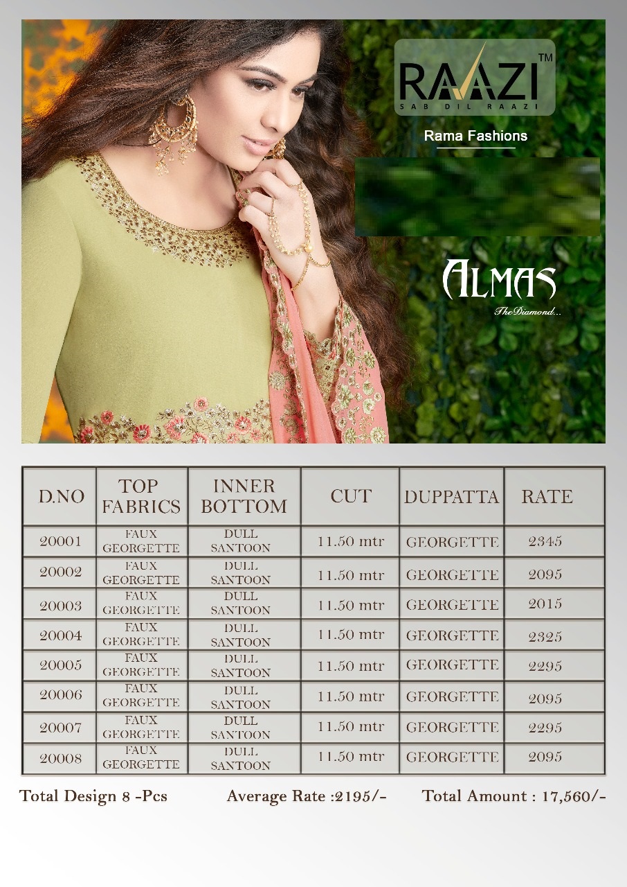 Buy Online Almas By Rama Series 20001 To 20008 Georgette Designer Party Wear Suits Wholesale Supplier And Dealer Surat 8 Pcs of Full Catalogue at Wholesale Price. Looking for Almas By Rama Series 20001 To 20008 Georgette Designer Party Wear Suits Wholesale Supplier And Dealer Surat Full Catalouge at Best Price? Buy Now Almas By Rama Series 20001 To 20008 Georgette Designer Party Wear Suits Wholesale Supplier And Dealer Surat at Wholesale Rate of Rs 17560 with Total 8 Pcs from authroized dealer and supplier of RAMA FASHIONS Brand. Cost of Each piece is just only Rs 2195 which is very low and affordable price to resale the product in your retail store ,This is Surat based Wholesale Supplier & Dealer of RAMA FASHIONS Brand. Click on Brand name to Know more about RAMA FASHIONS Brand's products.Call or Whatsapp on 9898838984 for booking or enquiry
