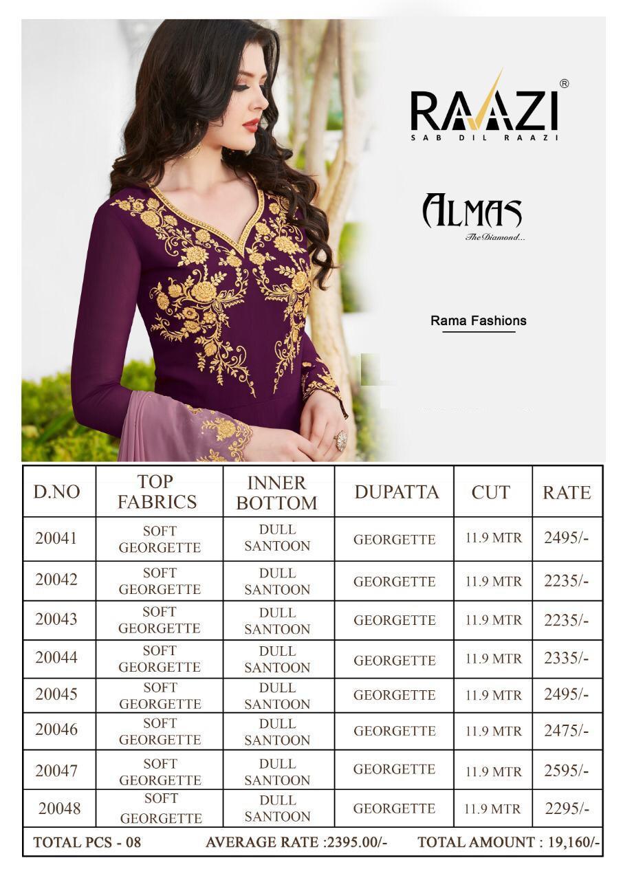 Buy Online Almas The Daimond By Rama Razi Series 20041 To 20048 Georgette Embroidered Designer Party Wear Suits Wholesale Supplier Gujarat 8 Pcs of Full Catalogue at Wholesale Price. Looking for Almas The Daimond By Rama Razi Series 20041 To 20048 Georgette Embroidered Designer Party Wear Suits Wholesale Supplier Gujarat Full Catalouge at Best Price? Buy Now Almas The Daimond By Rama Razi Series 20041 To 20048 Georgette Embroidered Designer Party Wear Suits Wholesale Supplier Gujarat at Wholesale Rate of Rs 19160 with Total 8 Pcs from authroized dealer and supplier of RAMA FASHIONS Brand. Cost of Each piece is just only Rs 2395 which is very low and affordable price to resale the product in your retail store ,This is Surat based Wholesale Supplier & Dealer of RAMA FASHIONS Brand. Click on Brand name to Know more about RAMA FASHIONS Brand's products.Call or Whatsapp on 9898838984 for booking or enquiry
