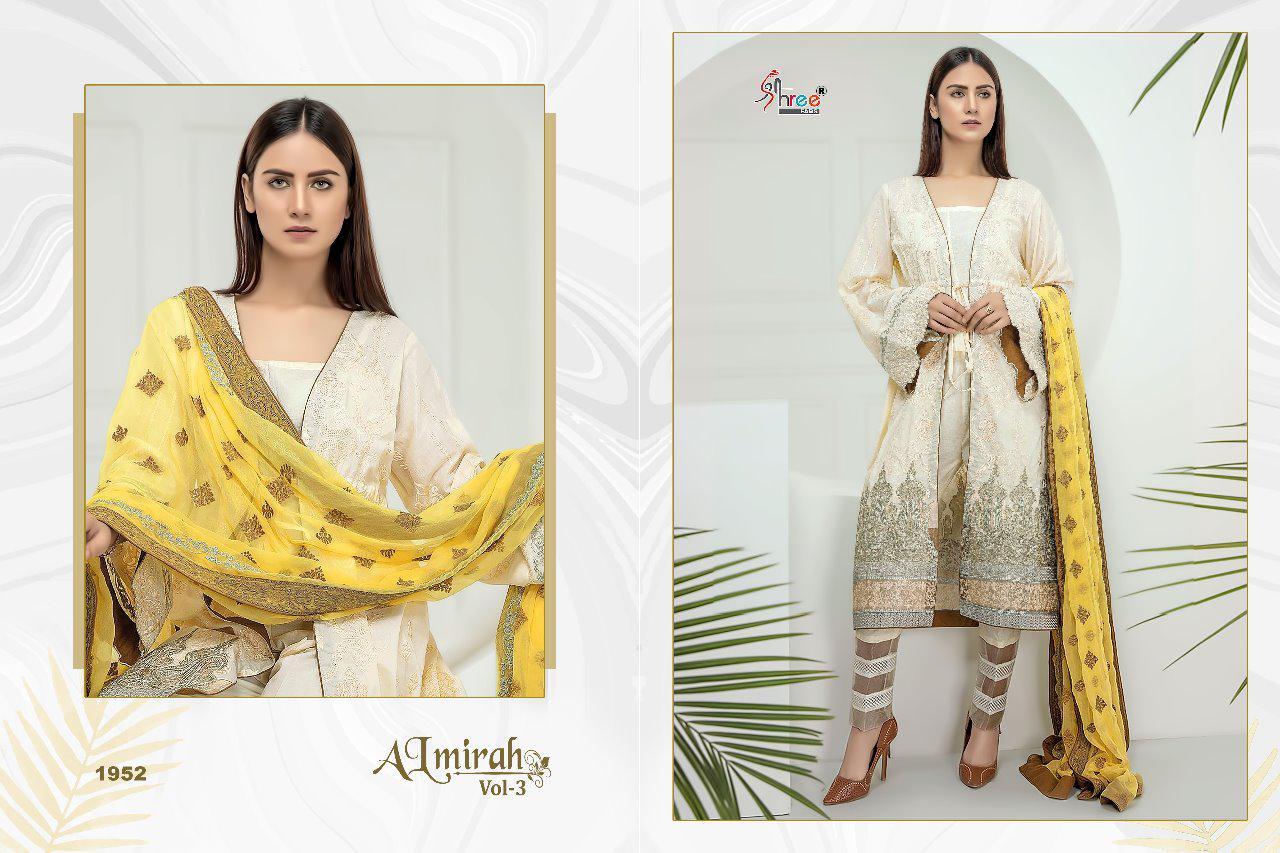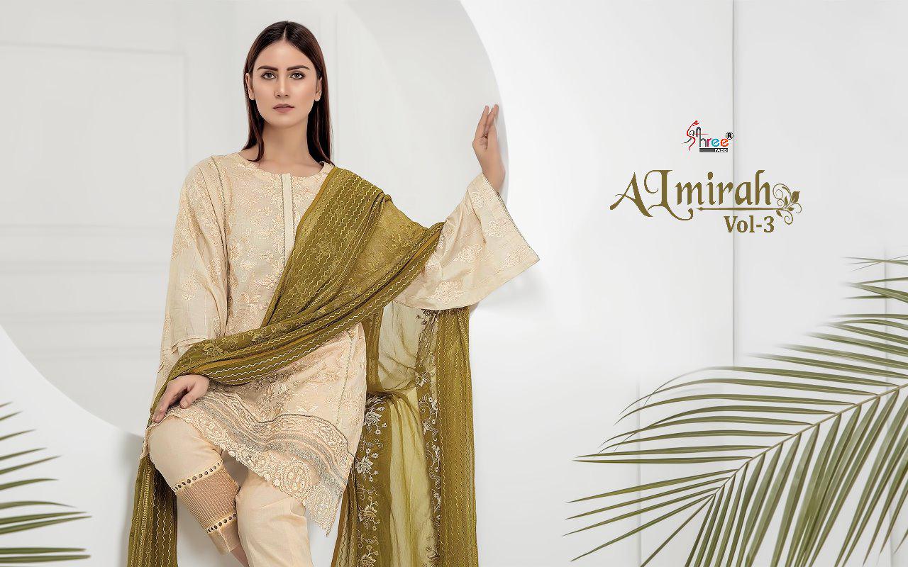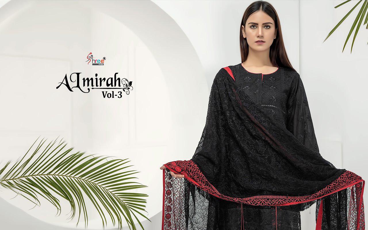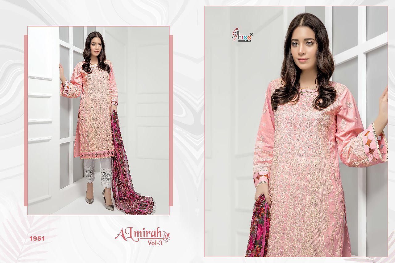 ALMIRAH VOL 3 Top pure cotton with heavy embrodery Bottom semilawn Duppta najmin embroderd & siffon digital print Des 6 Rate 899 Shree fabs surat |