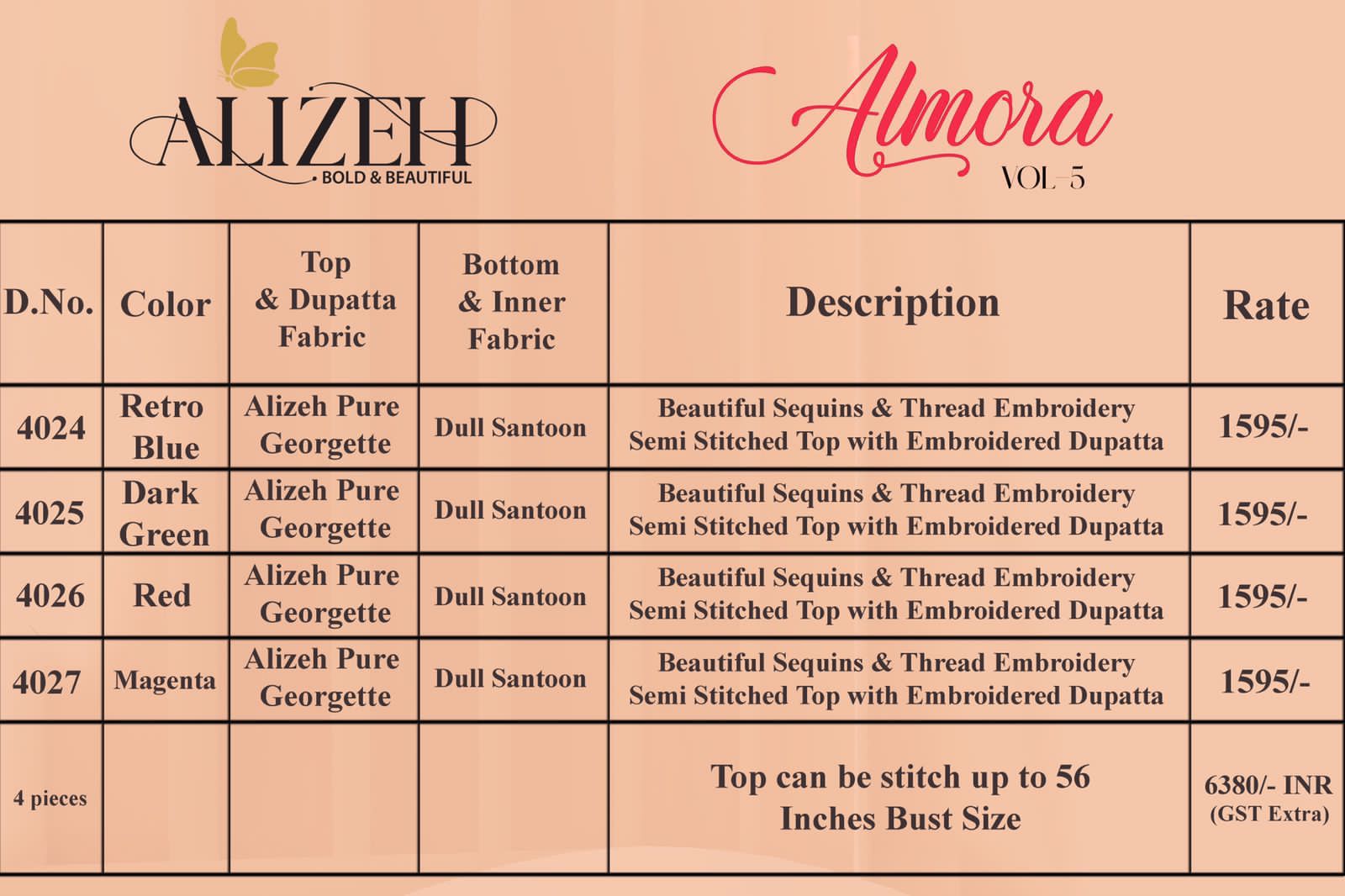 Buy Online Almora Vol 5 By Alizeh Official Single And Set Stockiest And Supplier From Surat 4 Pcs of Full Catalogue at Wholesale Price. Looking for Almora Vol 5 By Alizeh Official Single And Set Stockiest And Supplier From Surat Full Catalouge at Best Price? Buy Now Almora Vol 5 By Alizeh Official Single And Set Stockiest And Supplier From Surat at Wholesale Rate of Rs 6380 with Total 4 Pcs from authroized dealer and supplier of Brand. Cost of Each piece is just only Rs 1595 which is very low and affordable price to resale the product in your retail store ,This is Surat based Wholesale Supplier & Dealer of Brand. Click on Brand name to Know more about Brand's products.Call or Whatsapp on 9898838984 for booking or enquiry