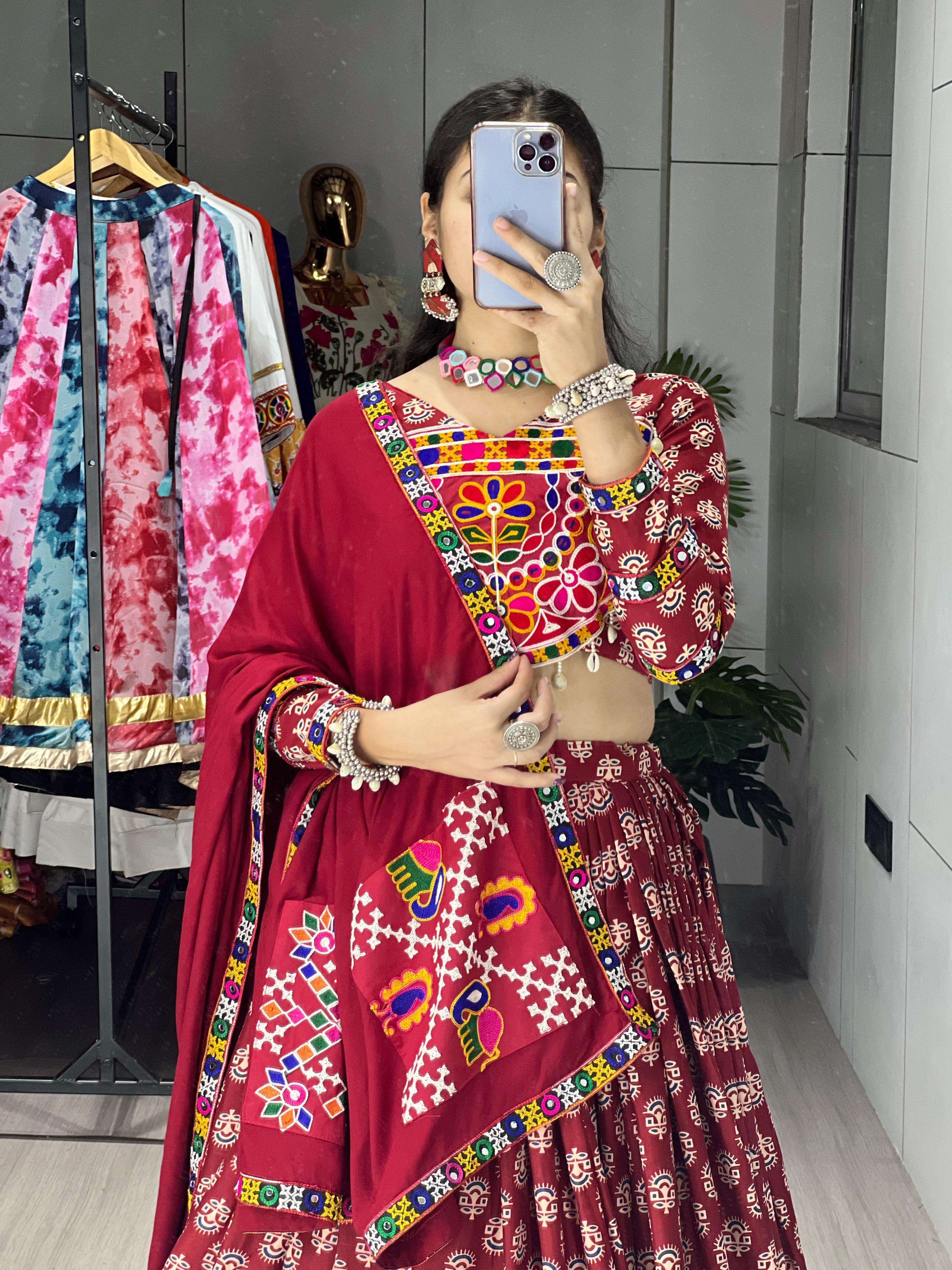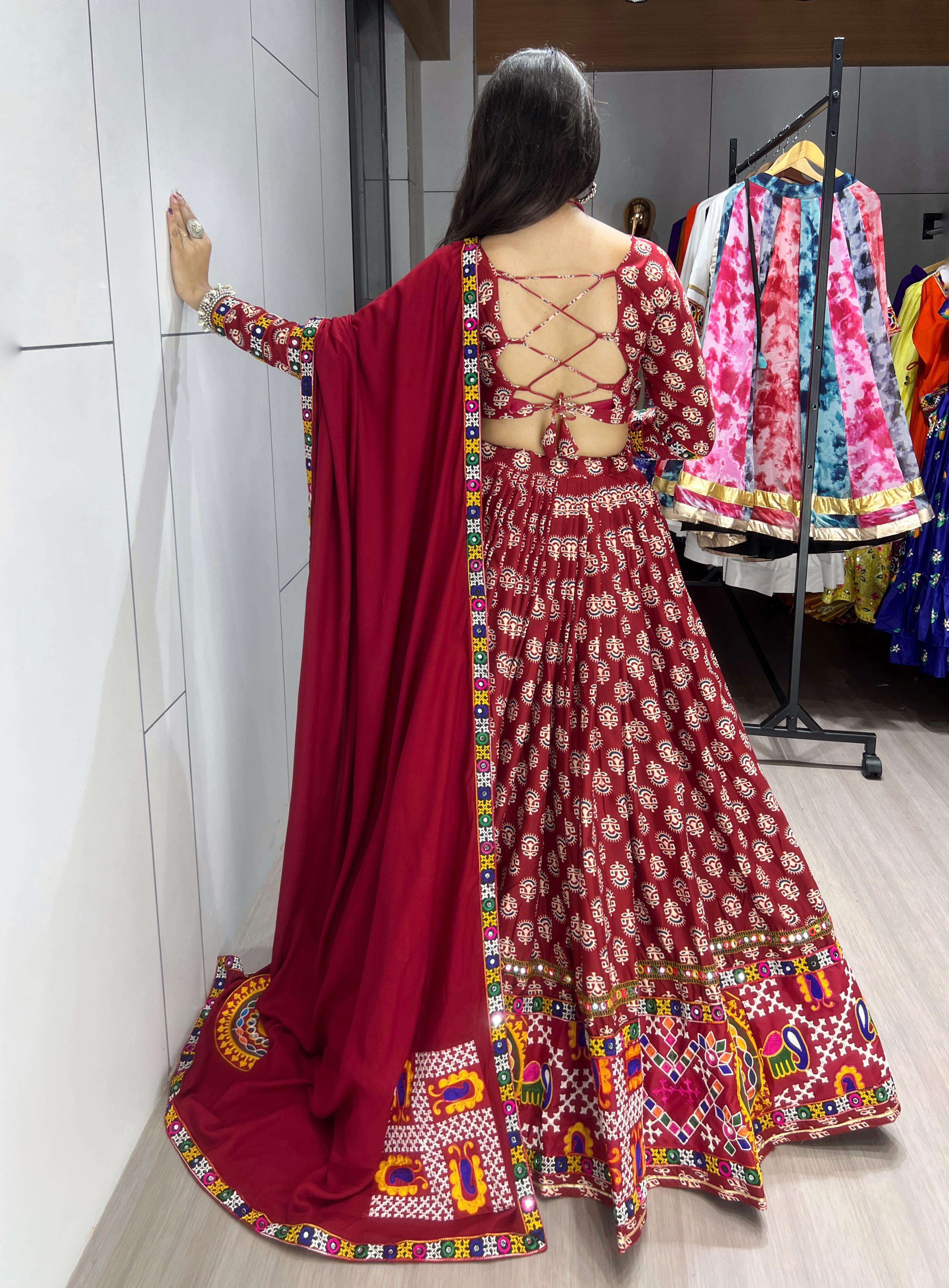 👗 Lehenga (Fully Stitched) • Fabric : Pure Rayon Cotton Ajarakh Prints • Color : Maroon • Work : Ajarakh Prints with Traditional Border featuring Chakra, Swastik, Mor, Vaastu + Real Mirror Work • Waist : Supported up to 44’’ • Closure : Drawstring & Zip • Stitching : Stitched with Canvas • Length : 41’’ • Flair : 6 Meter 😘 • Inner : Micro Cotton